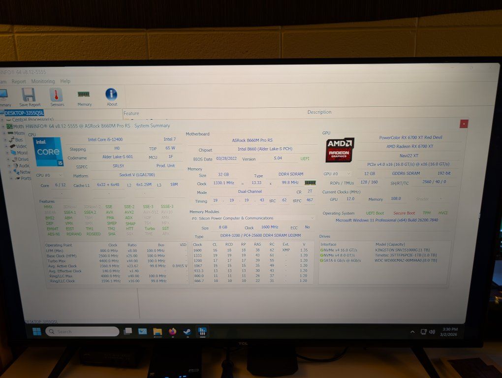 CPU - Intel i5 12400 CPU Cooler - Thermalright peerless assassin GPU - Powercolor Red Devil RX 6700 XT Motherboard - ASRock B660M Pro RS Micro ATX LGA1700 Memory - Silicon Power Gaming 16 GB DDR4-3200 CL16 Storage - 1TB Kingston NvME SSD + 1 TB timetec NvME SSD Case - NZXT H710i PSU - EVGA 550 B5 80+ Bronze - fully modular WIFI - I installed a WiFi card, but can't remember anything about it (sorry)