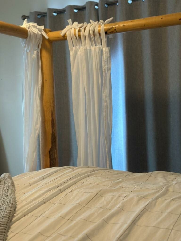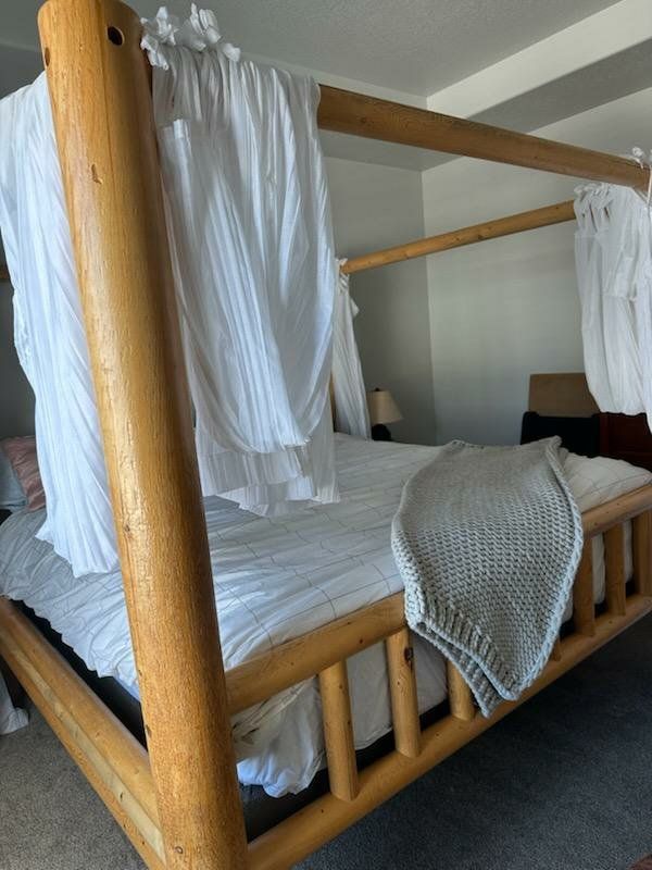 VenmoPine log 4-post king bed frame and stool (bed is tall). Excellent condition. Excludes mattress/box springs.