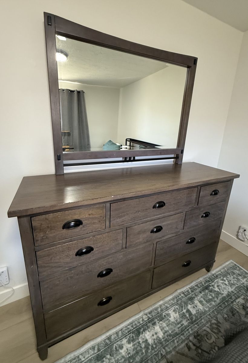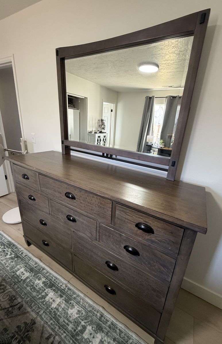 VenmoDresser is solid wood and includes mirror. High quality in great shape. Top 3 drawers are velvet lined, the rest are cedar. Offers tons of storage. Measures 64” W x 19” D x 42” H. Add an additional 37.5” H with mirror attached. See my other ads for matching night stand. Prefer text (801) 471-6585.