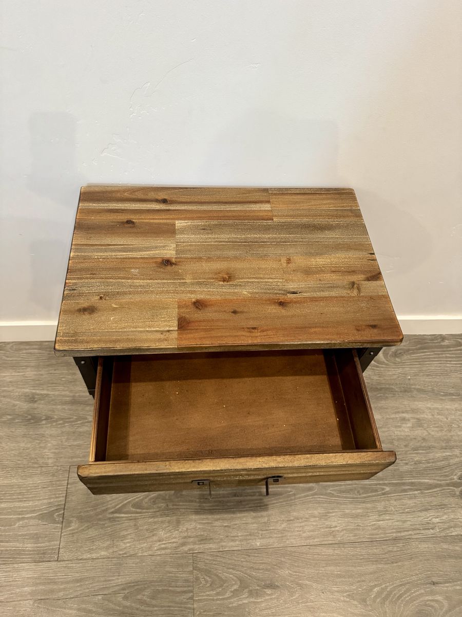 ZelleThis beautiful night stand/side table is the perfect pairing of modern industrial and rustic charm. Sturdy, real wood, construction with convenient front drawer and lower shelf providing ample storage.