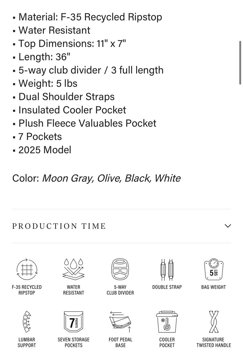 Lightweight golf bag. Tons of storage, large cooler pocket, large 5 way top so no club tangle