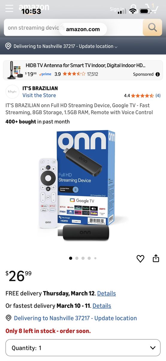 Great deal on this like new Onn full hd streaming device for Google tv. Comes as shown with accessories in box! ! These are currently 26.99 on amazon now as shown in photos! Don’t pay retail prices, call Dustin instead at 801-205-3404, I need it gone!