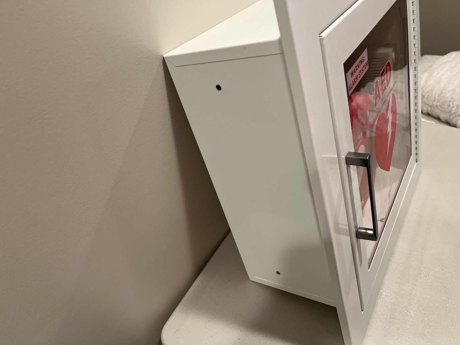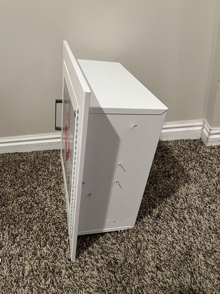 This is an in-the-wall mounted AED box in perfect condition. In-wall dimensions are 14 x 14 x 6.5 inches. Makes a clean, visible place for pepole to see. Also, there is a plastic sign you can post if needed. There is good space for other first aid supplies as needed. Call or text me at 801-319-5697