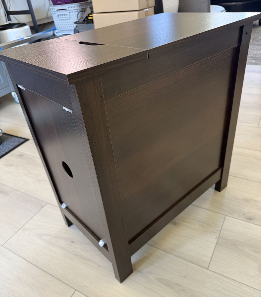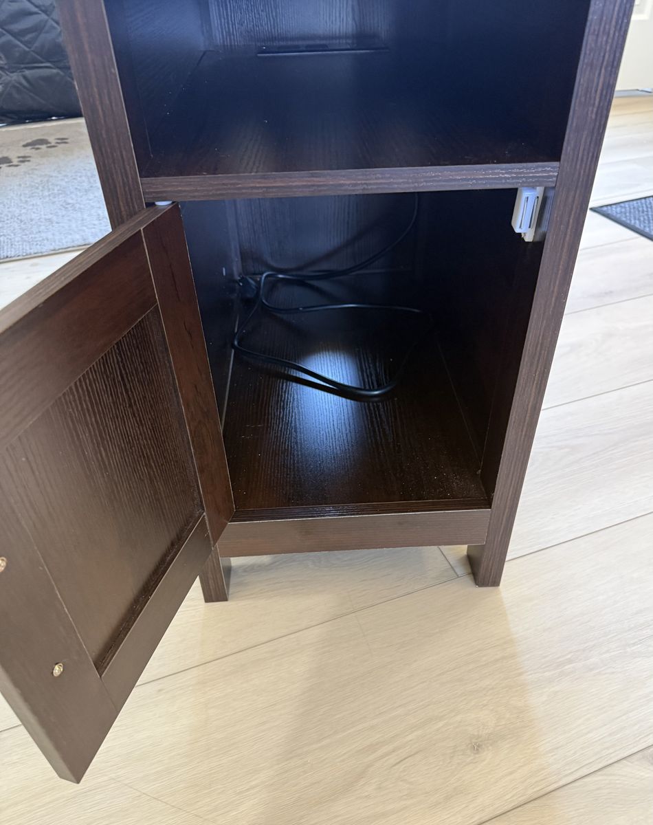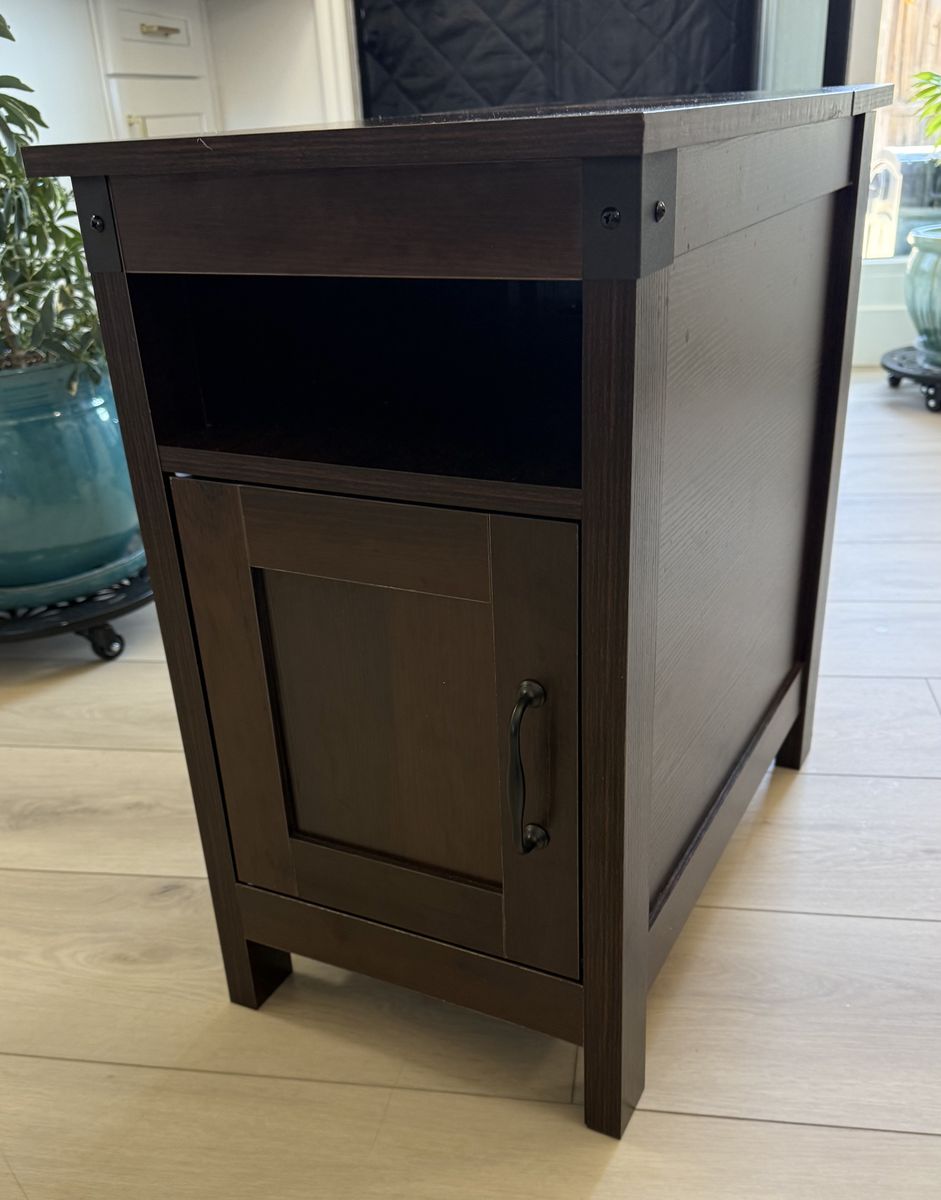 VenmoThis is a great end table that includes built in plugs and charging station. Hidden opening for cord management. Measures 13.5” W x 23.5” D x 23.75” H. Prefer text (801) 471-6585.