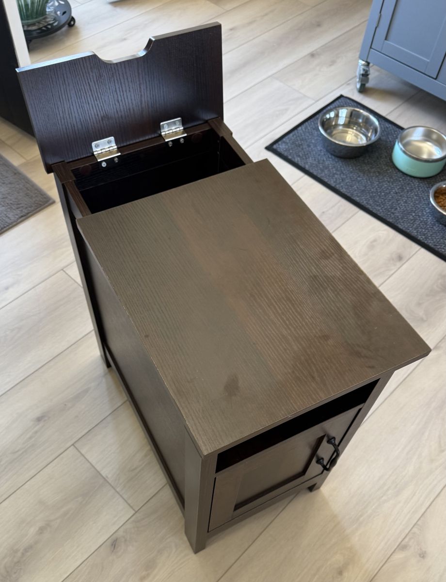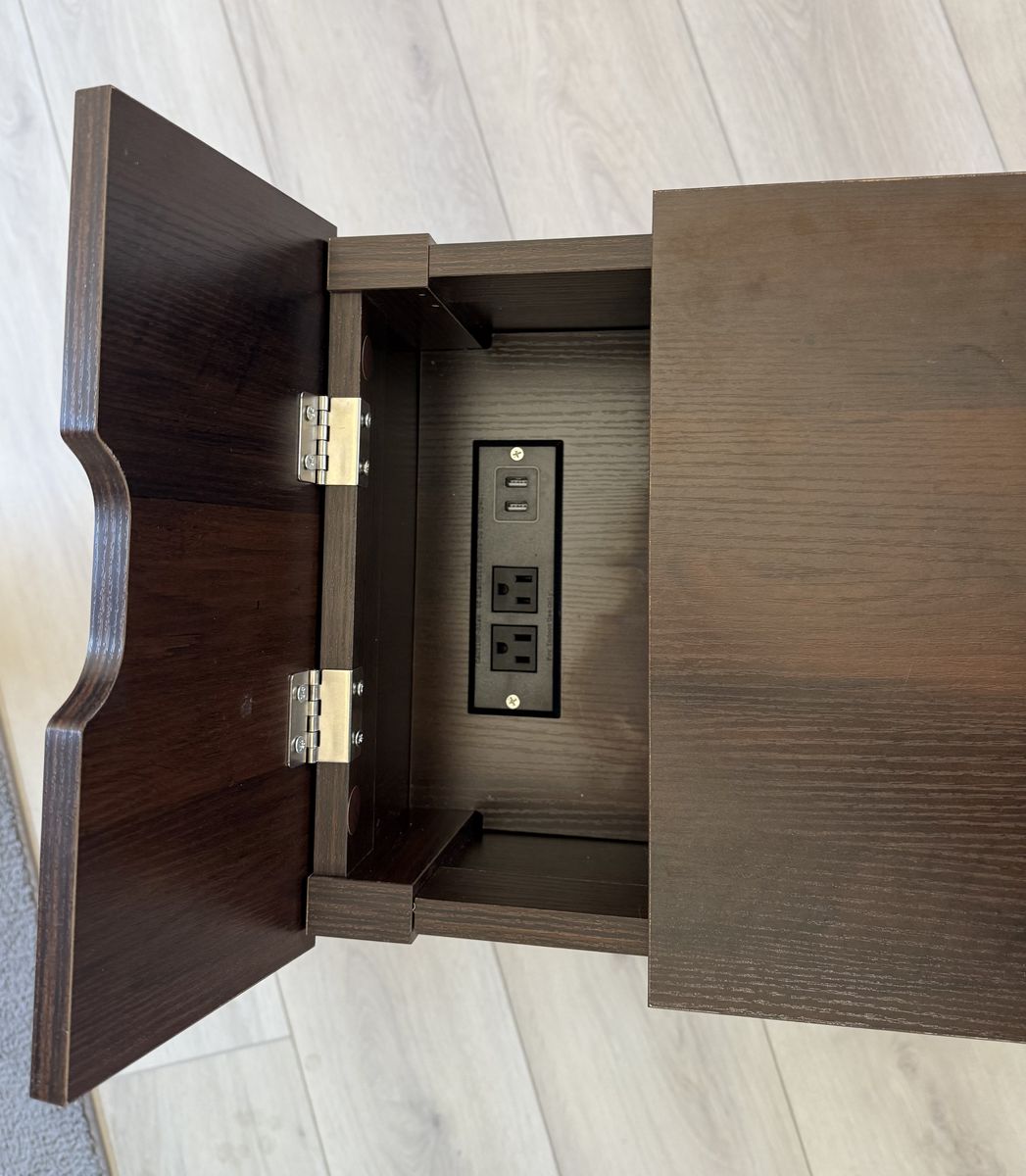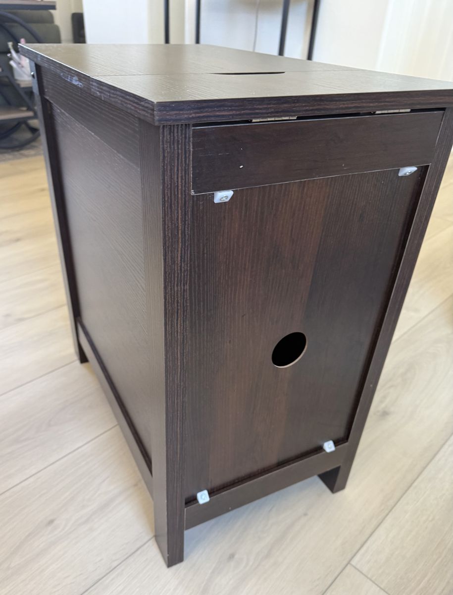 VenmoThis is a great end table that includes built in plugs and charging station. Hidden opening for cord management. Measures 13.5” W x 23.5” D x 23.75” H. Prefer text (801) 471-6585.