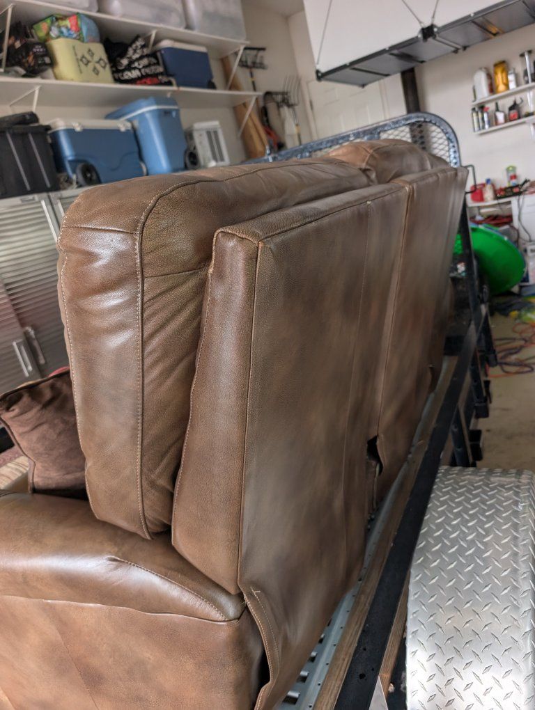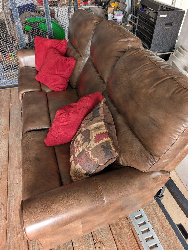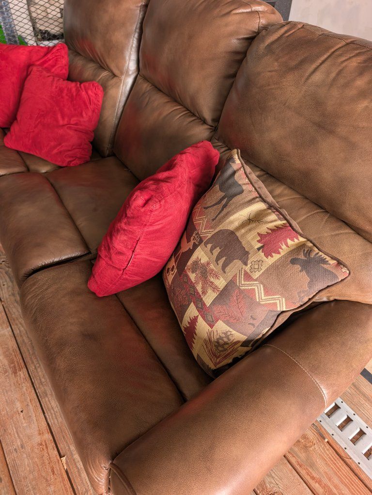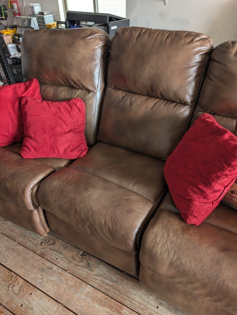 Venmothis is a beautiful brown leather couch that is used but in great condition. just a little normal wear. it has two powered reclining chairs.