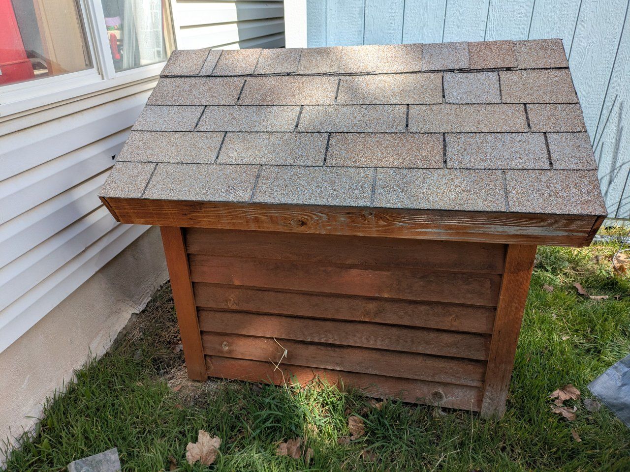 Venmo3ft wide and 3ft 8in deep at the base. about 3 1/2 ft tall. 2x4 frame, cedar siding, asphalt shingles.