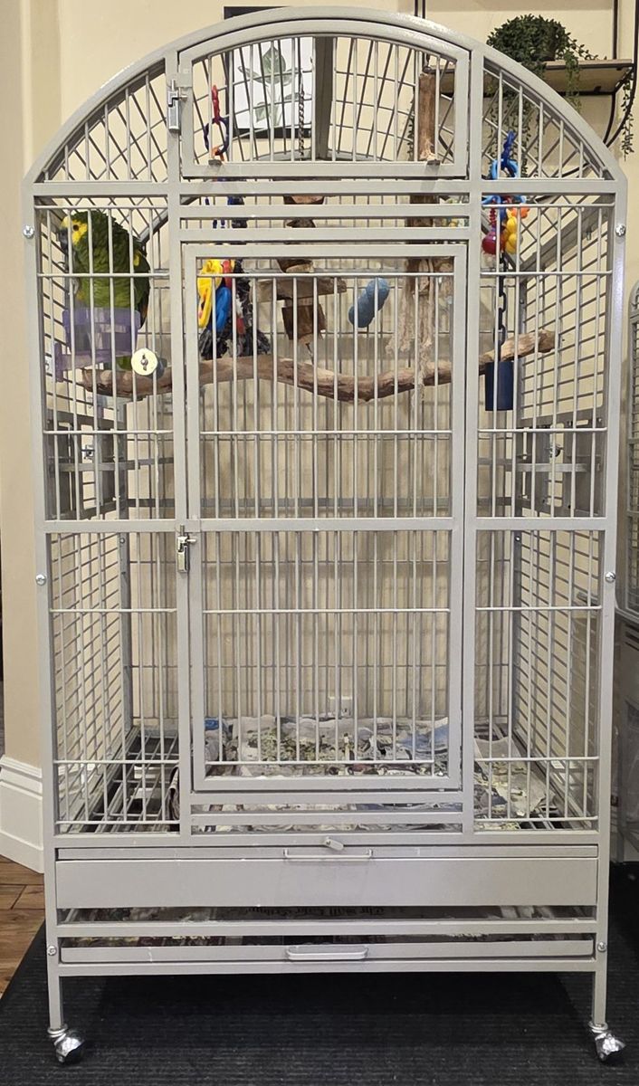 Tiki will go to his new home with: • Extra-large powder-coated cage (28" deep × 36" wide × 64 ¾" tall floor to top) • All his toys • Food and water bowls • His Roudybush pellets he’s eaten his whole life