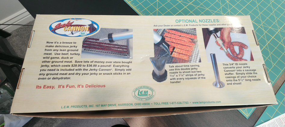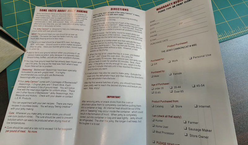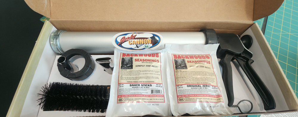 New Heavy duty 1 1/2 lb jerky cannon. Complete kit comes with 1 stainless steel jerky nozzle, 1 stainless steel snack stick nozzle, nylon cleaning brush, 2 packages of seasoning however I don't know how old these are so use these at your own risk Includes the instructions as well. Pick up in Hooper