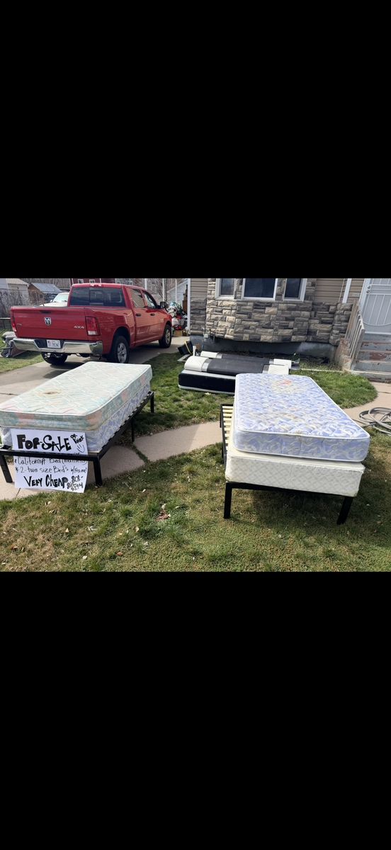 GooglePayThese are practically so cheap their almost free. I’ll take prob any offer. The Cali King is only 1 year old and only myself and my children slept on it. The cover to the mattress itself is removable and just needs a good cleaning. The bed was $$1800 for the entire set. However the frame got dirty only needs to be wiped. The main issue is not the headboard nor the foot board. It’s the sides that are broken. It cleans easy. The frame is broken and so you would have to fix the sides of the frame. The twin size beds are a couple years old but the frames and box springs are in great condition. The mattresses however look not the prettiest. Just needs to be cleaned but most likely stained unlike the cali king. The stains on the cali should clean. I also have a queen mattress that’s not to bad but it is worn has a couple of tiny fixable tears. A iron on patch would work. We have always used sheets just sometimes the kids spilled things on there mattresses. These are Not the greatest looking beds however they are put together nicely and they have the right kind of cushion. No springs sticking out or anything at all. So you make an offer. They are dirt cheap. If no one grabs they go to DI.