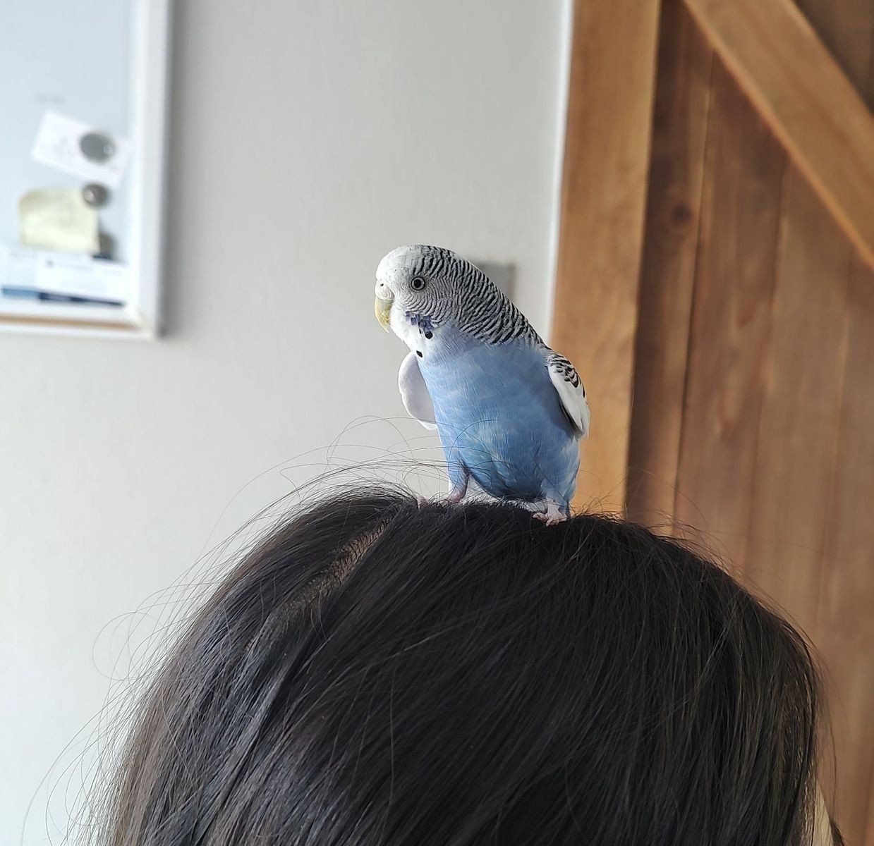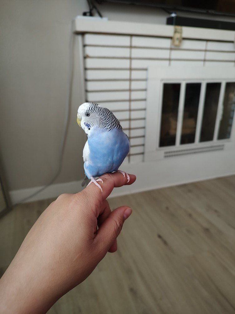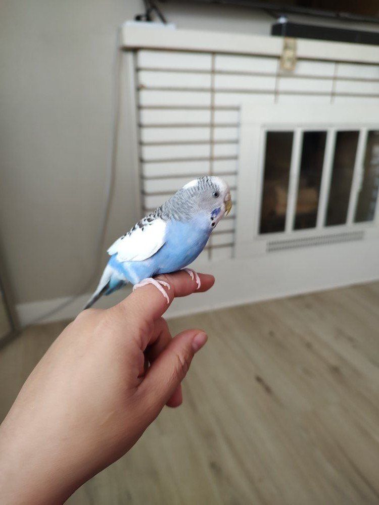 She is about 3 years old and will perch on your finger but she sometimes pecks if you try to perch her without her wanting to. She will also hang around on your shoulder. I am getting rid of her because she fights with my other parakeet. Will probably do best as a lone bird or until she finds her true love partner. cage or food not included