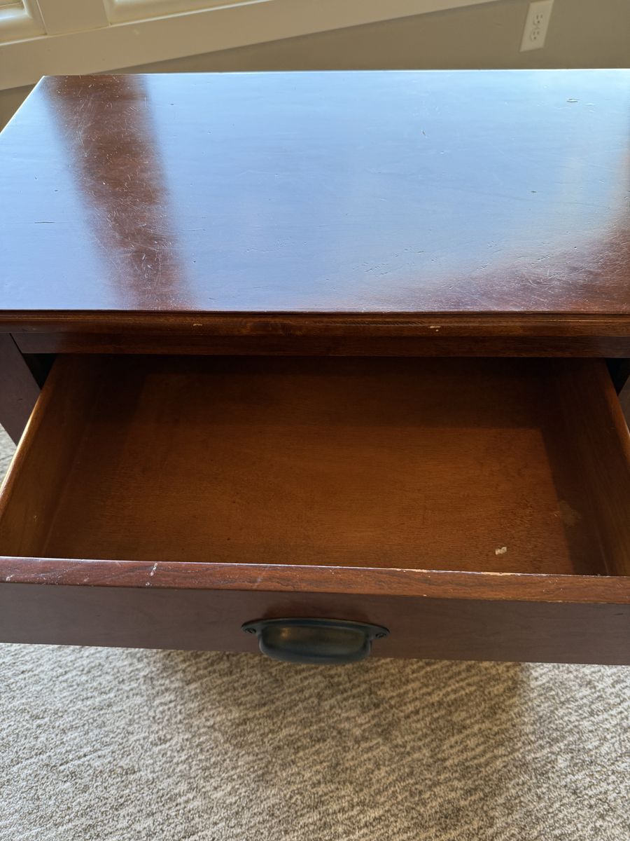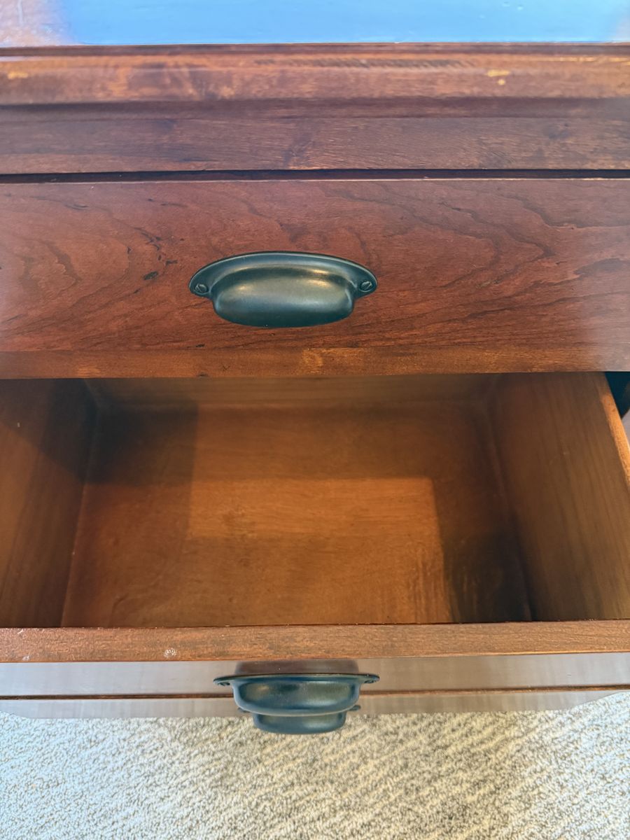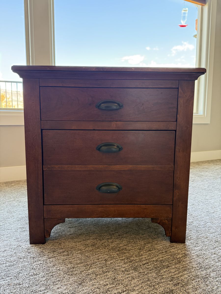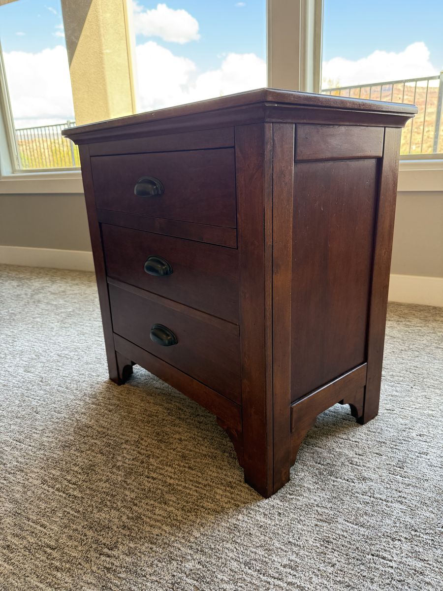 Beautiful solid wood nightstand with a rich, warm finish. Features 3 spacious drawers with classic dark metal pulls for plenty of storage. Sturdy, well-built, and in great condition with minimal wear.