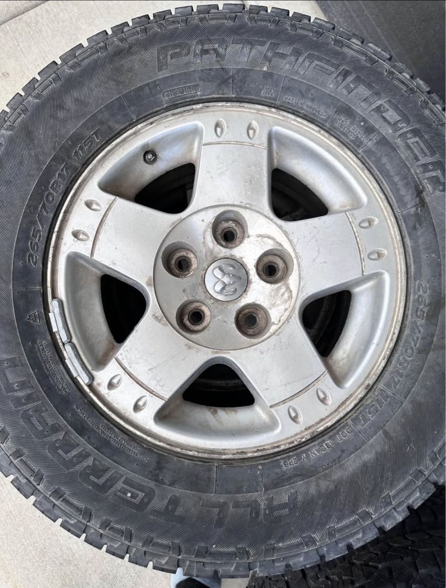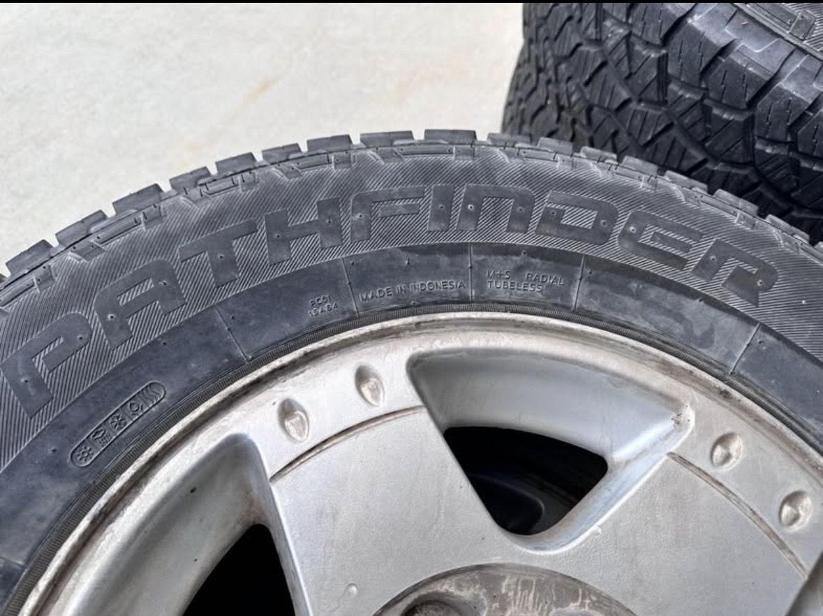 Venmo4x like new truck tires and rims. All-Terrain Pathfinder 265/70R17/115T. Located in Eagle Mountain/Utah County. FCFS Venmo, Zelle, Apple Pay, or cash.