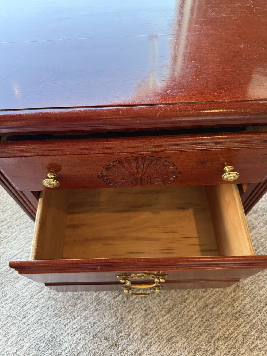 Beautiful red wood nightstand with a rich, elegant finish and classic brass hardware. Features 3 drawers for convenient storage and a timeless design that fits well in bedrooms or living spaces.