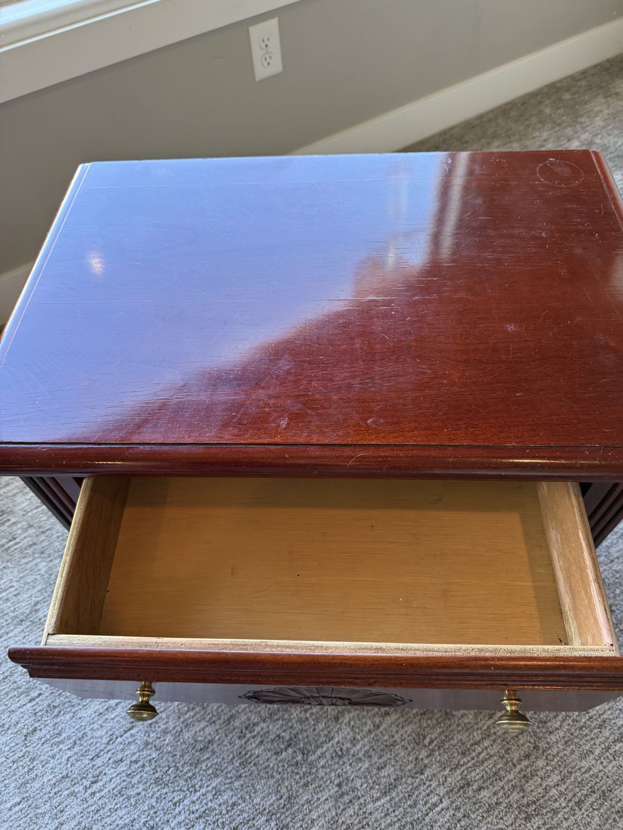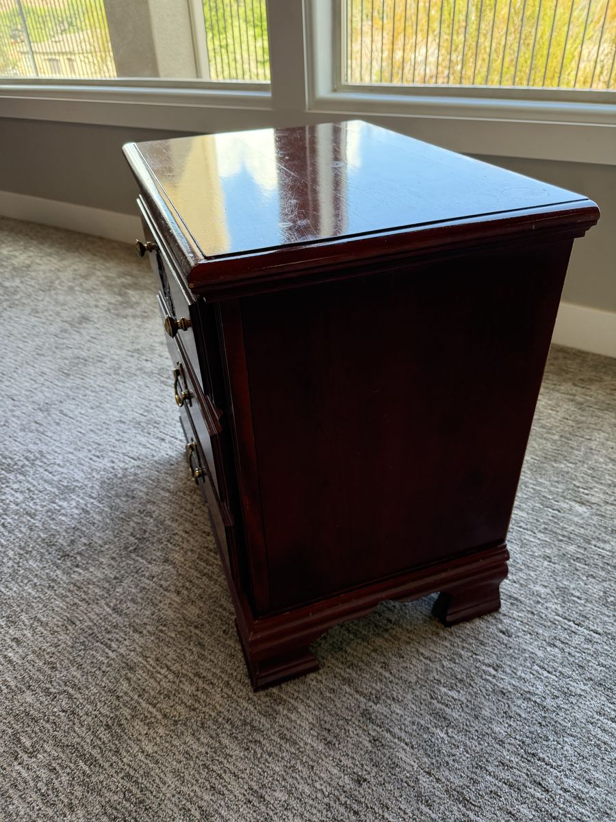 Solid, sturdy, and well kept with minimal wear. Perfect as a bedside table, accent piece, or small dresser.