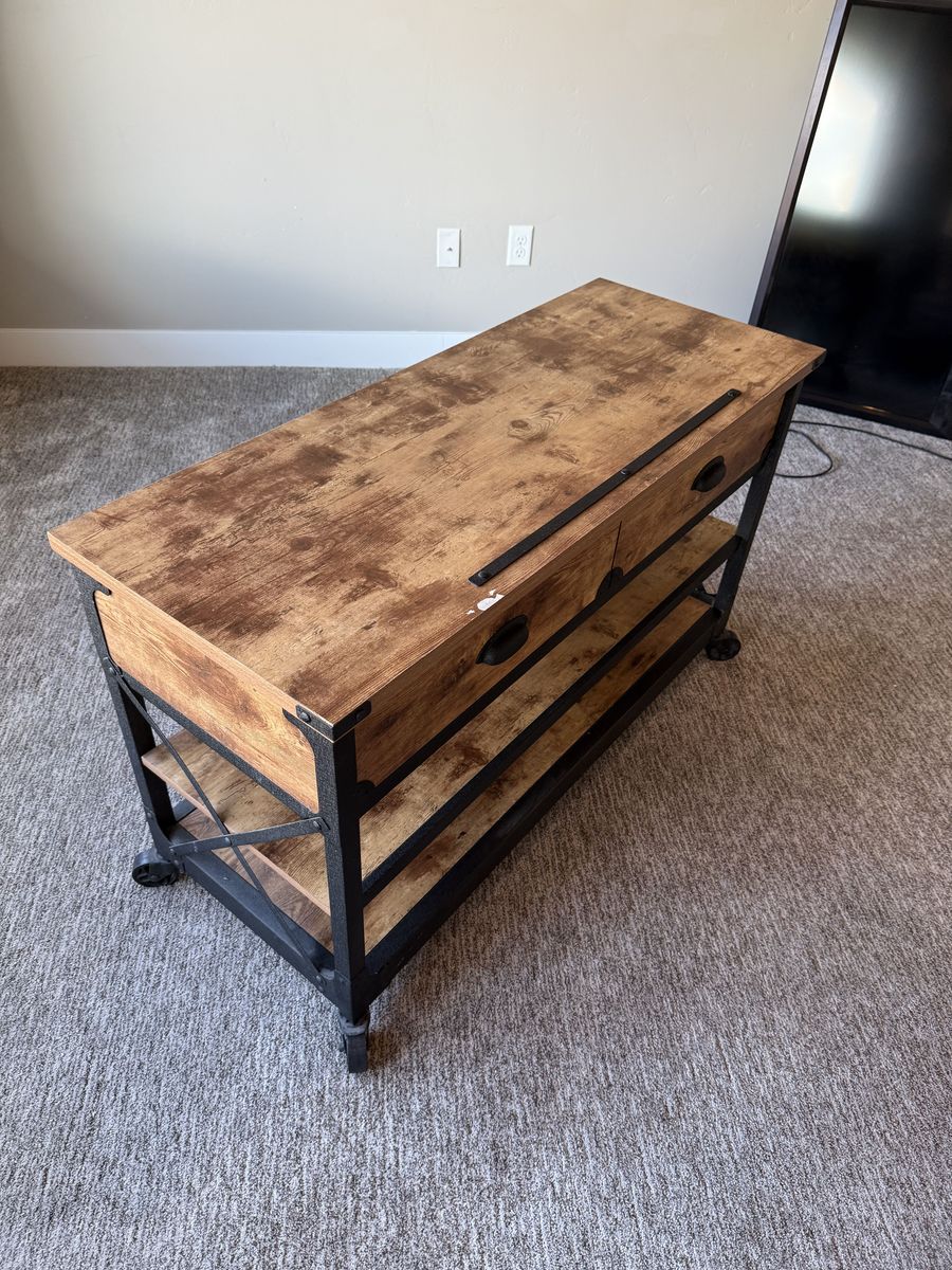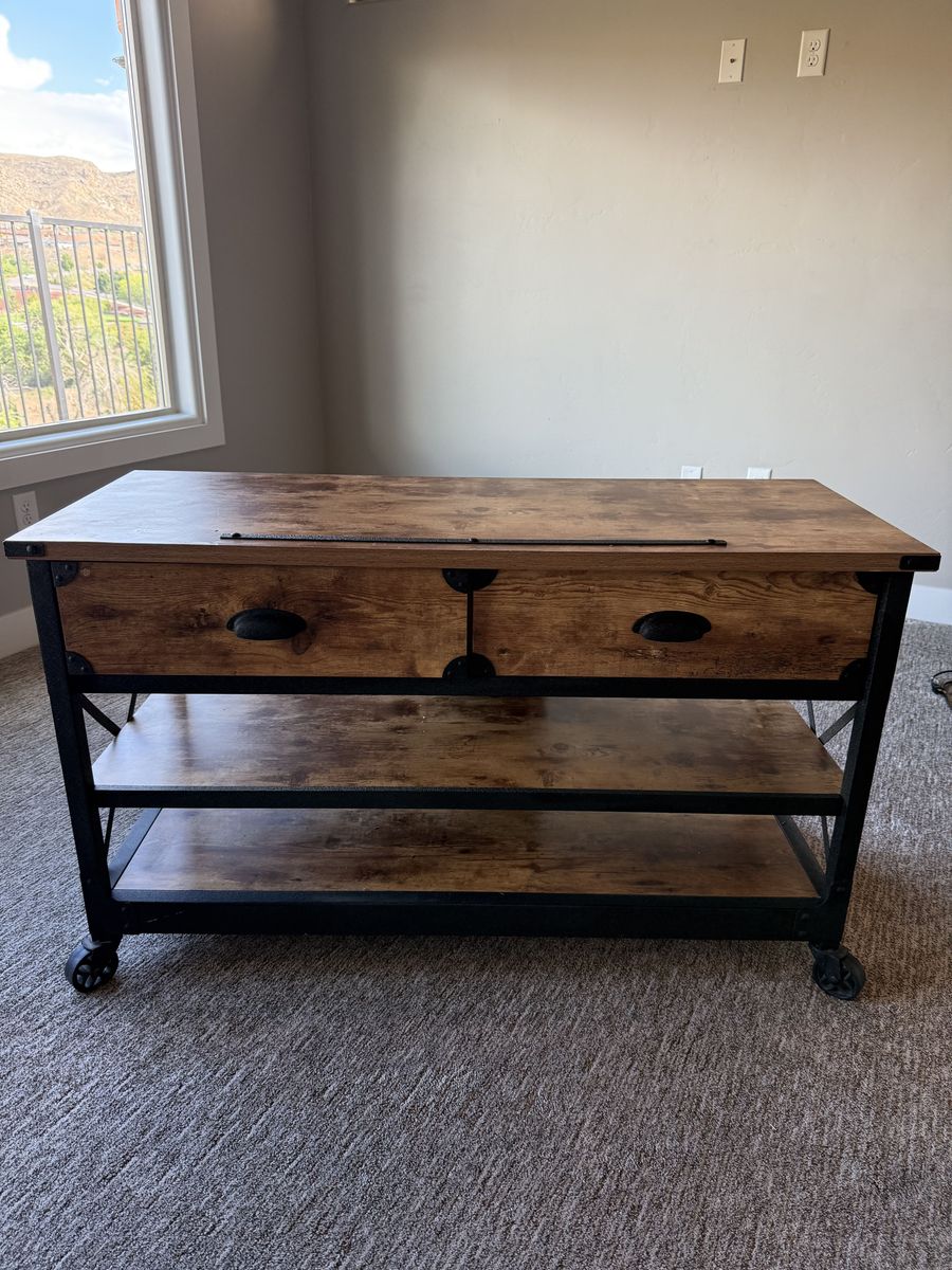 Stylish rustic entertainment center with a wood top and sturdy black metal frame. Features two drawers for storage and a lower shelf perfect for game consoles, media players, or décor. Rolling wheels make it easy to move when needed.