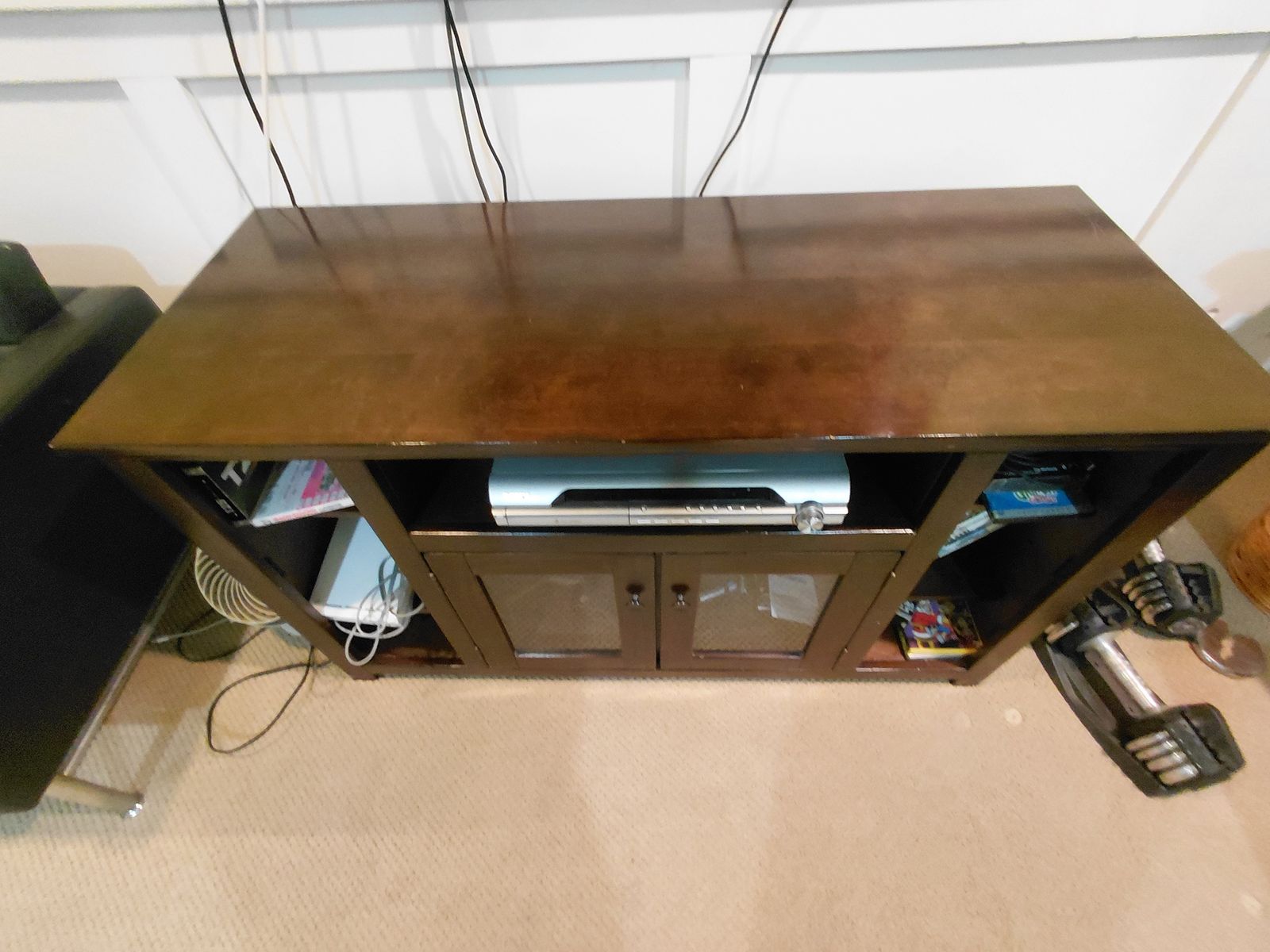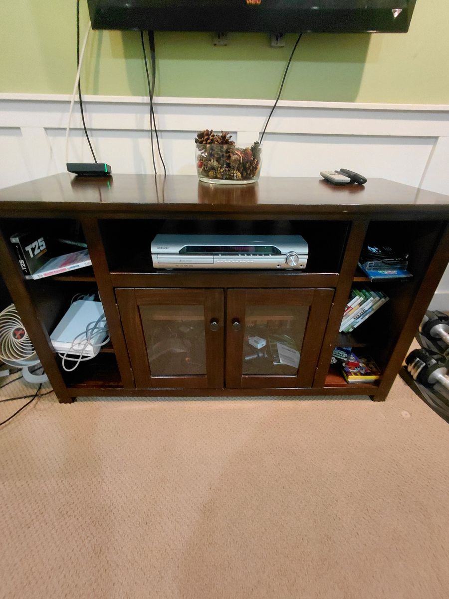 Entertainment Console/Credenza is 50" Long x 20" deep x 29" High. This piece is in great condition. Has 3 side shelves on each side, 1 main open shelf and another split shelf inside the glass doors.