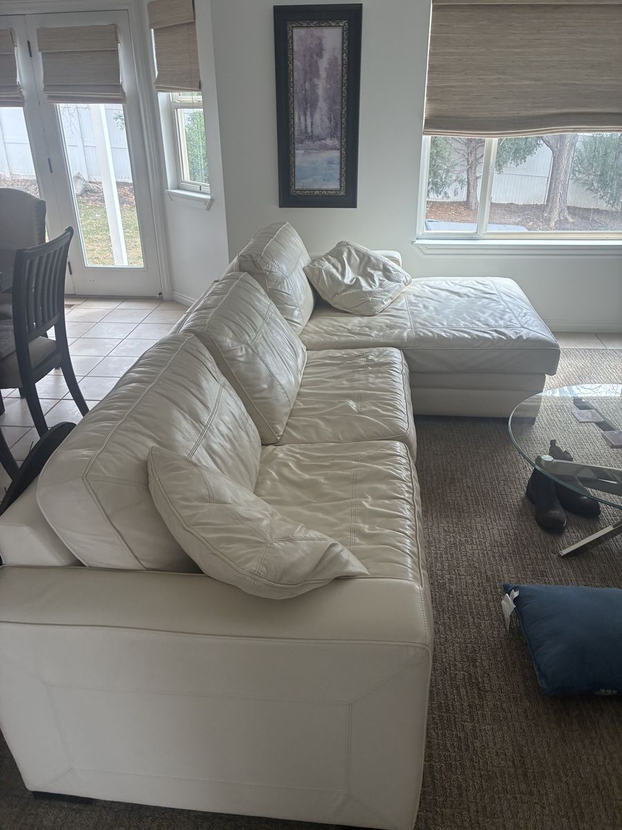 ApplePay12 year old leather couch. Overall in good condition but needs a good cleaning. Nothing is sprung and it’s really comfortable