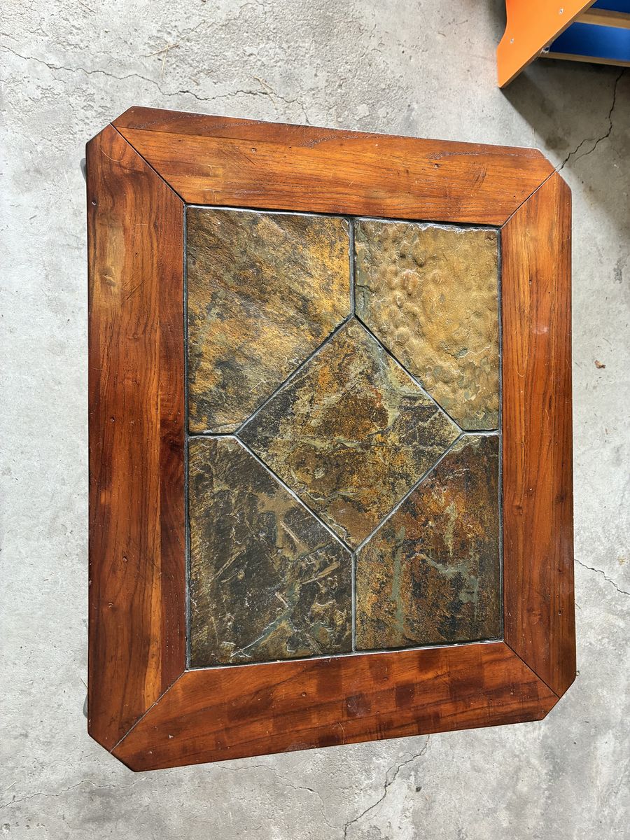 VenmoBeautiful set of matching end tables featuring warm wood frames with inlaid slate tile tops and sturdy wrought iron bases with decorative scroll legs and lower grid shelf. Solid and heavy — built to last.