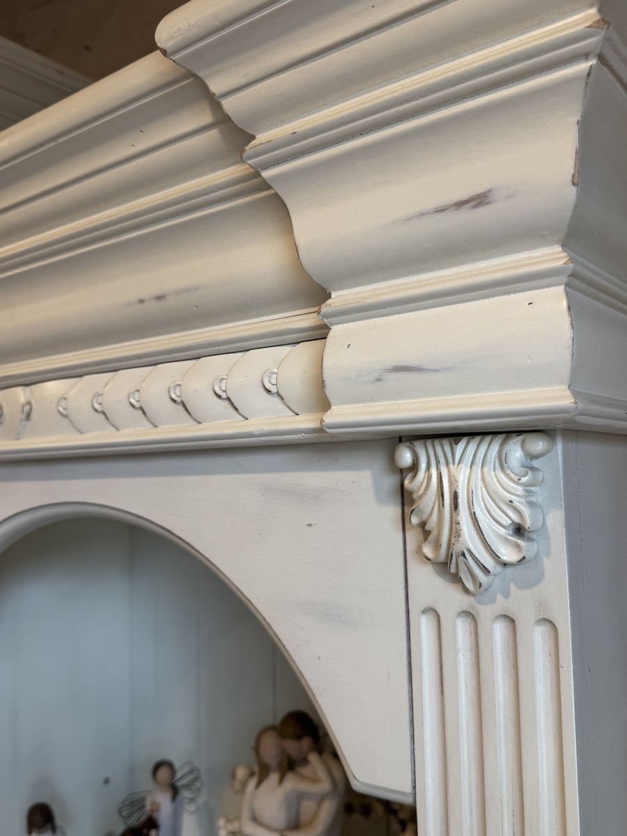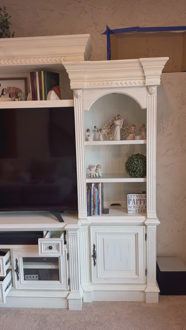 Elevate your living room with this stunning, high-end 4-piece entertainment center. This unit features a classic shabby chic or distressed off-white finish, accented with elegant crown molding, fluted pilasters, and intricate acanthus leaf carvings. It is as functional as it is beautiful, offering a massive amount of storage for media, books, and decor.