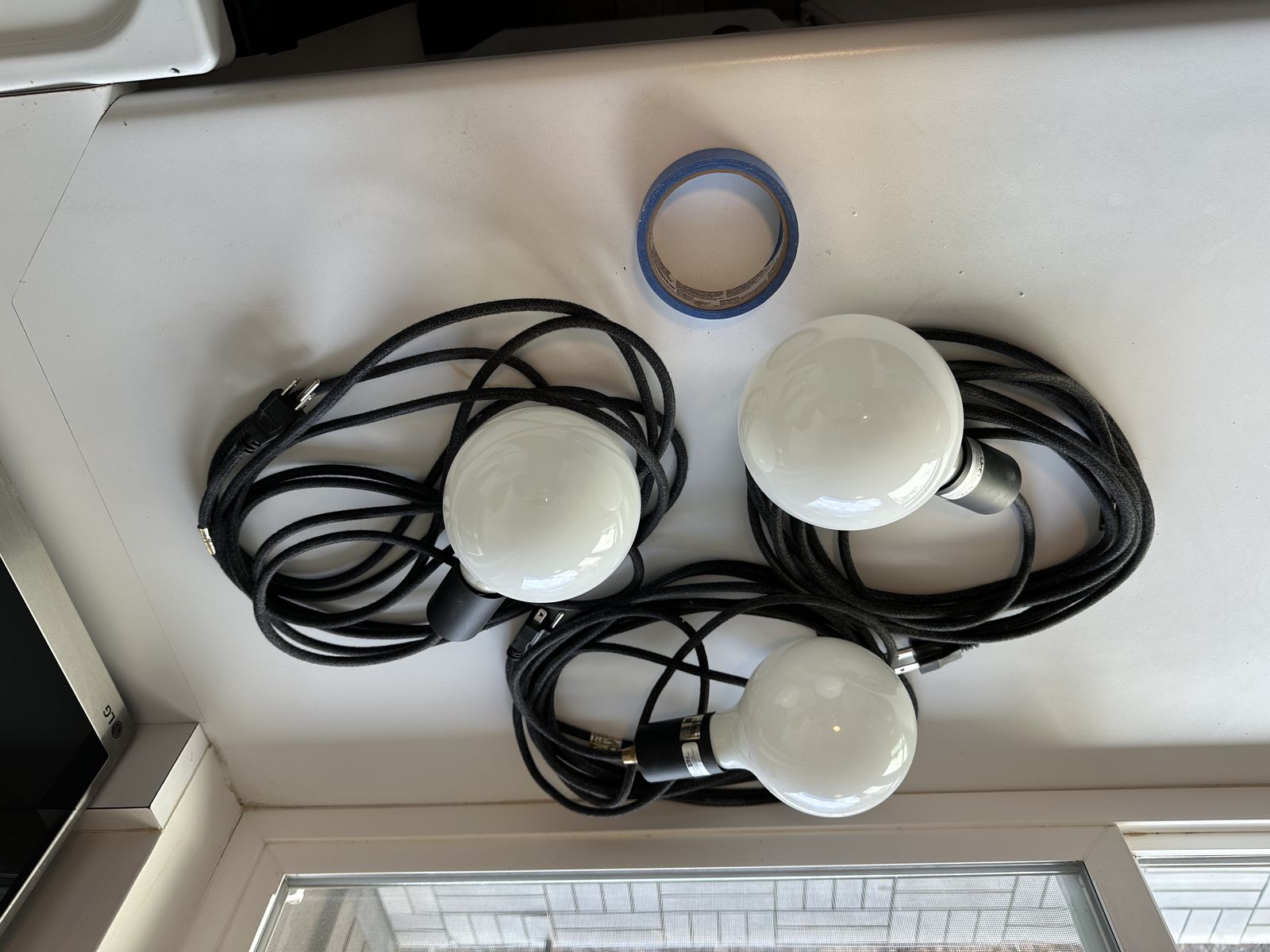 ZelleThree plug light fixtures with 20 ft cords. They were strung up the wall and across the ceiling in a bedroom when I bought a place. No delivery or shipping. Cash or Venmo only.