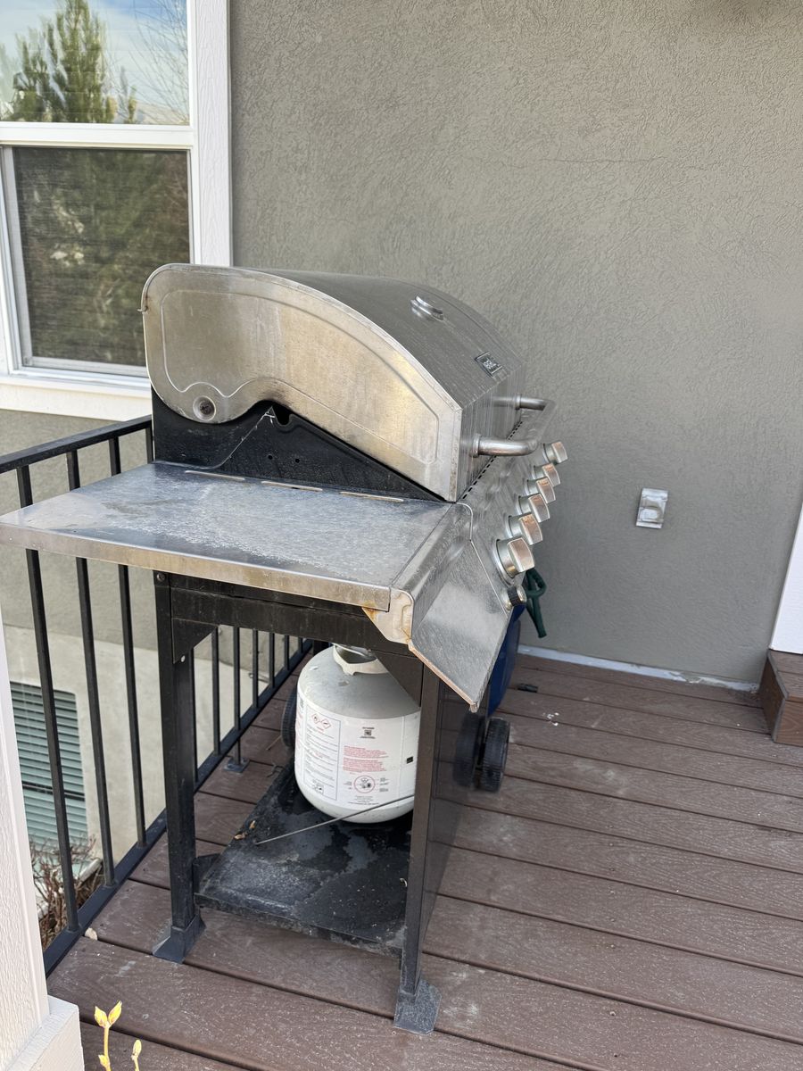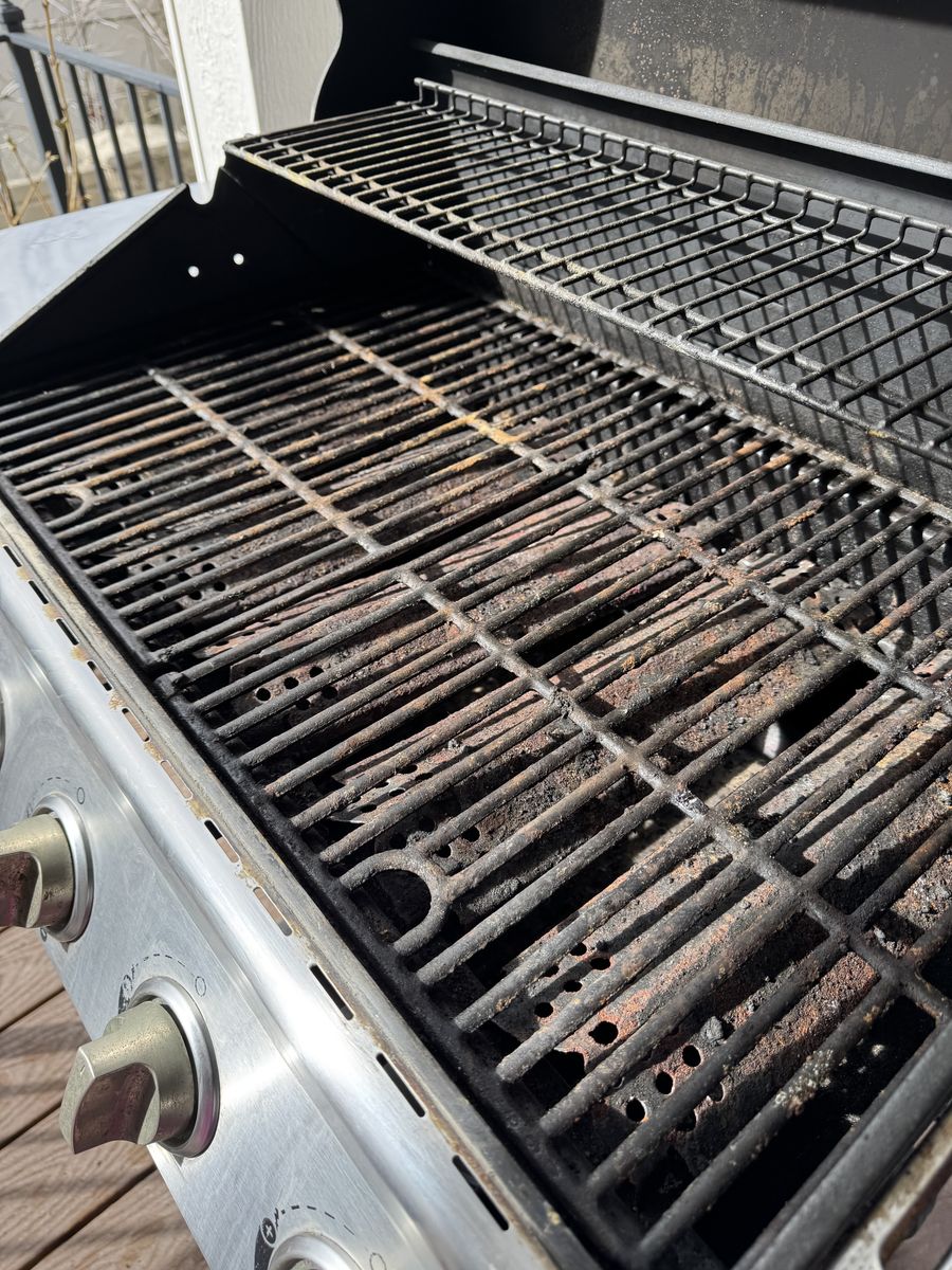 Gas grill with tank. Works except for Ned’s match/zippo to ignite. Needs to be cleaned and drip pans need to be replaced. Must take grill and tank together