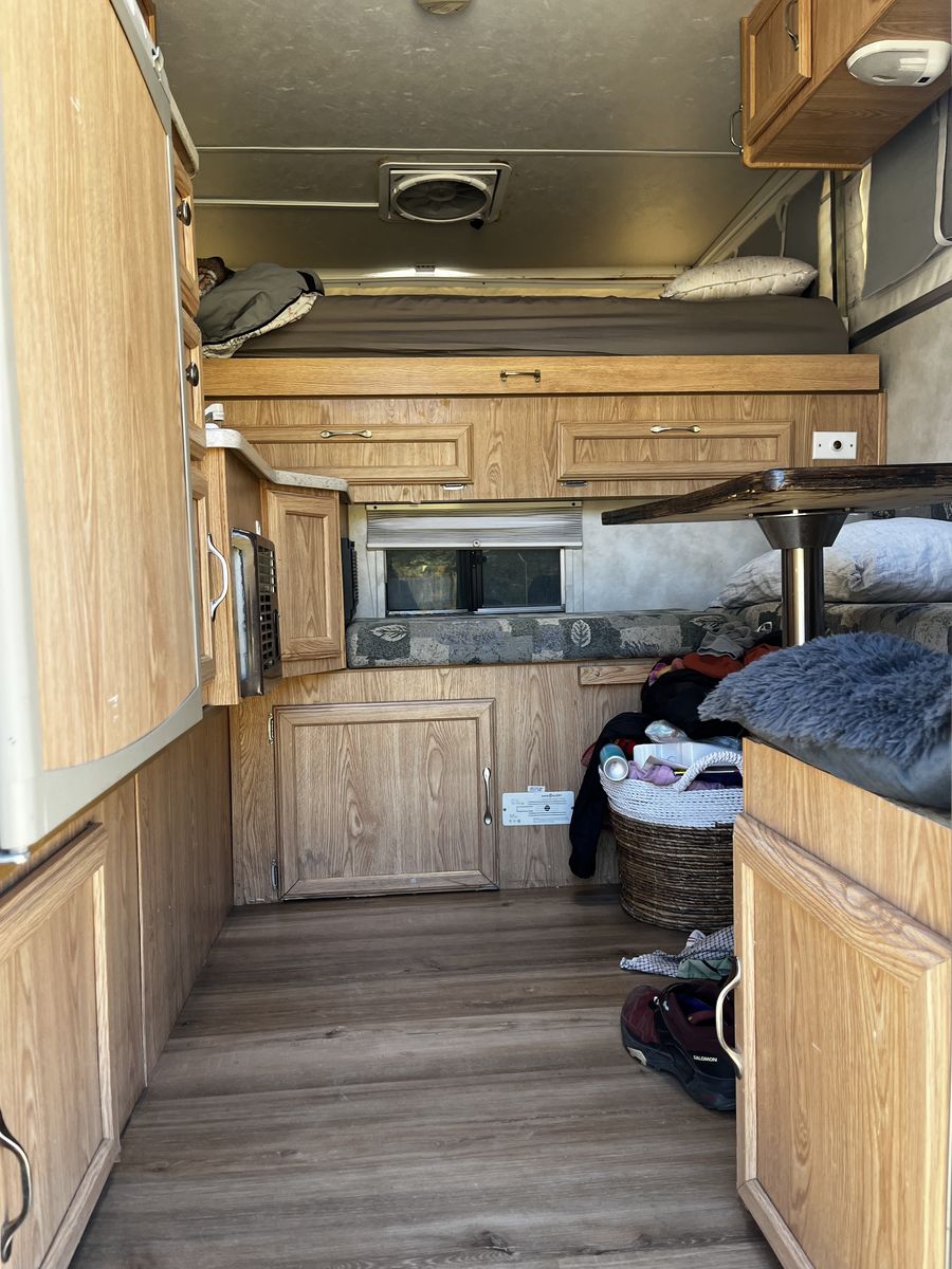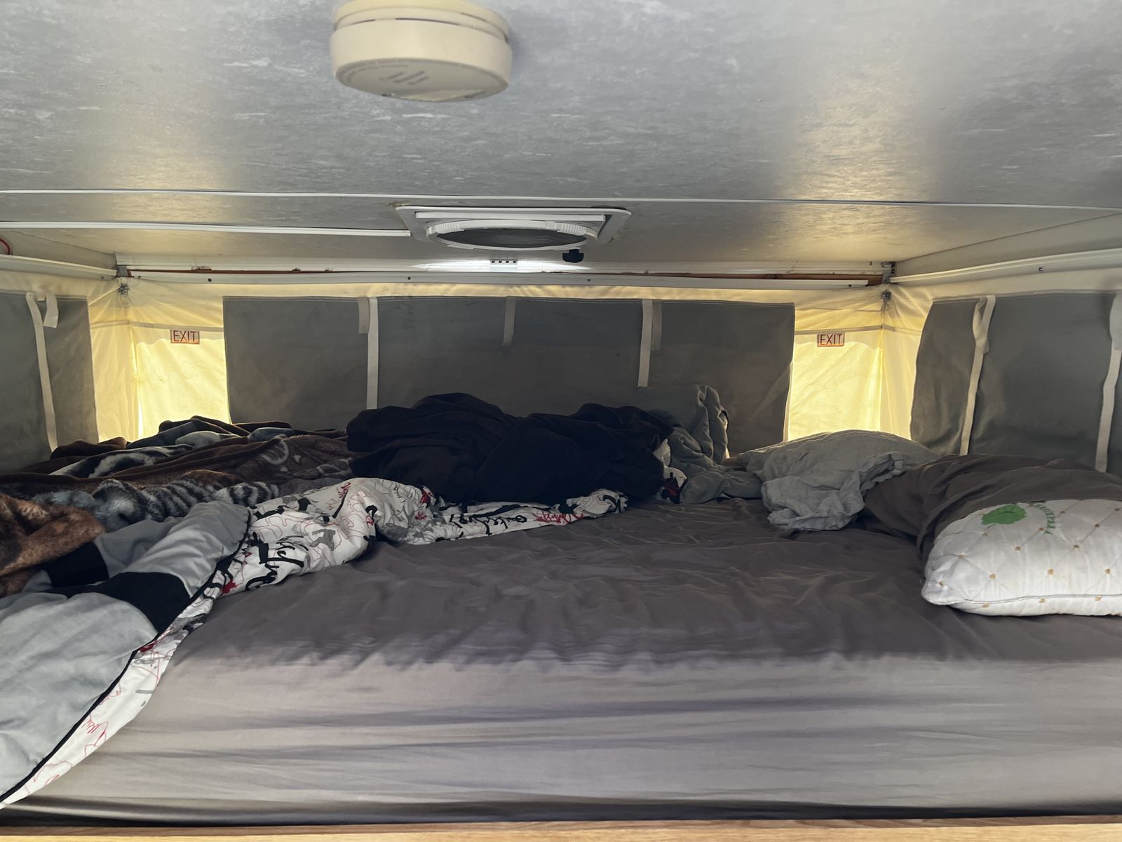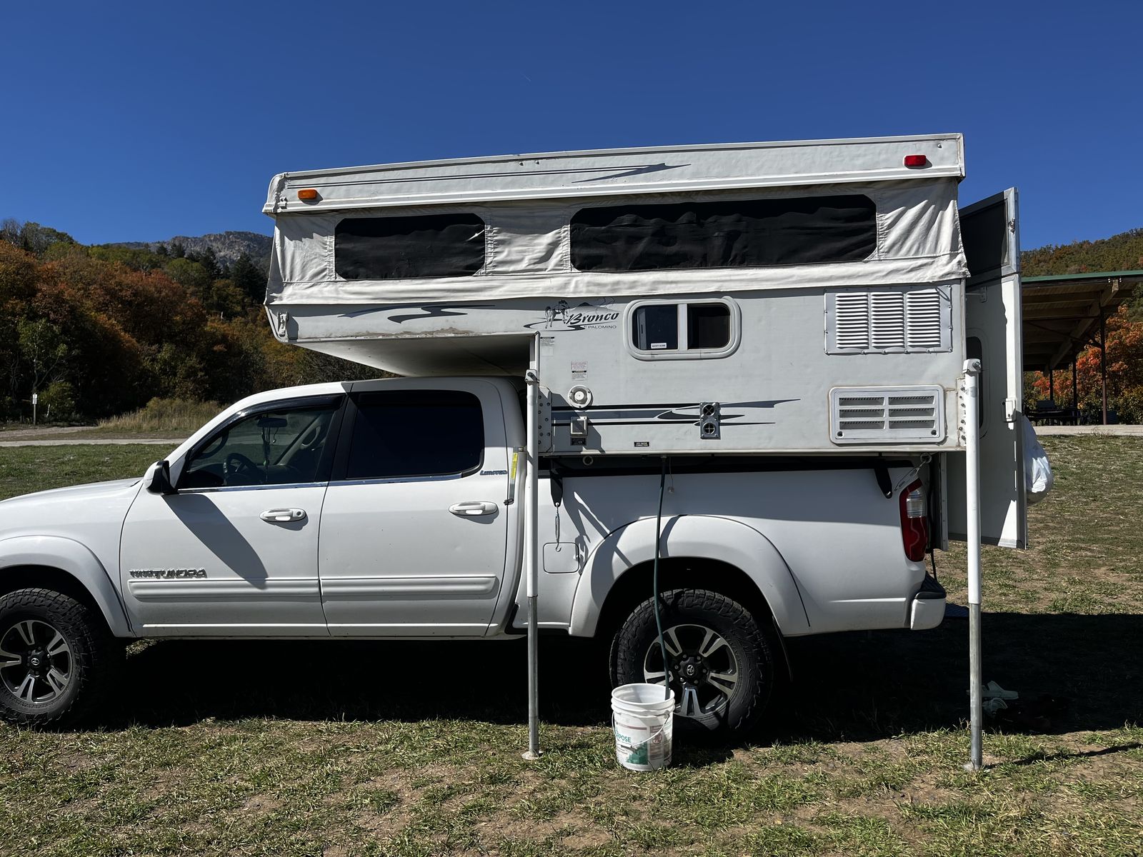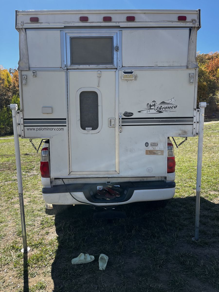 Venmo2007 palomino bronco 800 pop-up, dry weight is 1200 lbs it fits in a 6' 4" bed with tail off. I installed a new floor when I got it three years ago removed the back cubord To make the bench longer and full size bed, no major holes is canvous but some of the screen has tears in it, the fan vent ubove bed was leaking so I replaced it but could never get the fan to work and never worried about it it dose not have a title they didn't nake titles for campers till 2015 but I have bill of sale, fridge and stove works great. had a shop look at and fix corner of roof, it's been an awesome camper but have a younger kid and want something with a bed the closer to the floor i have Brophy Stake Pocket Mounted Camper Tie-Downs and turn buckles and chains for it price is OBO