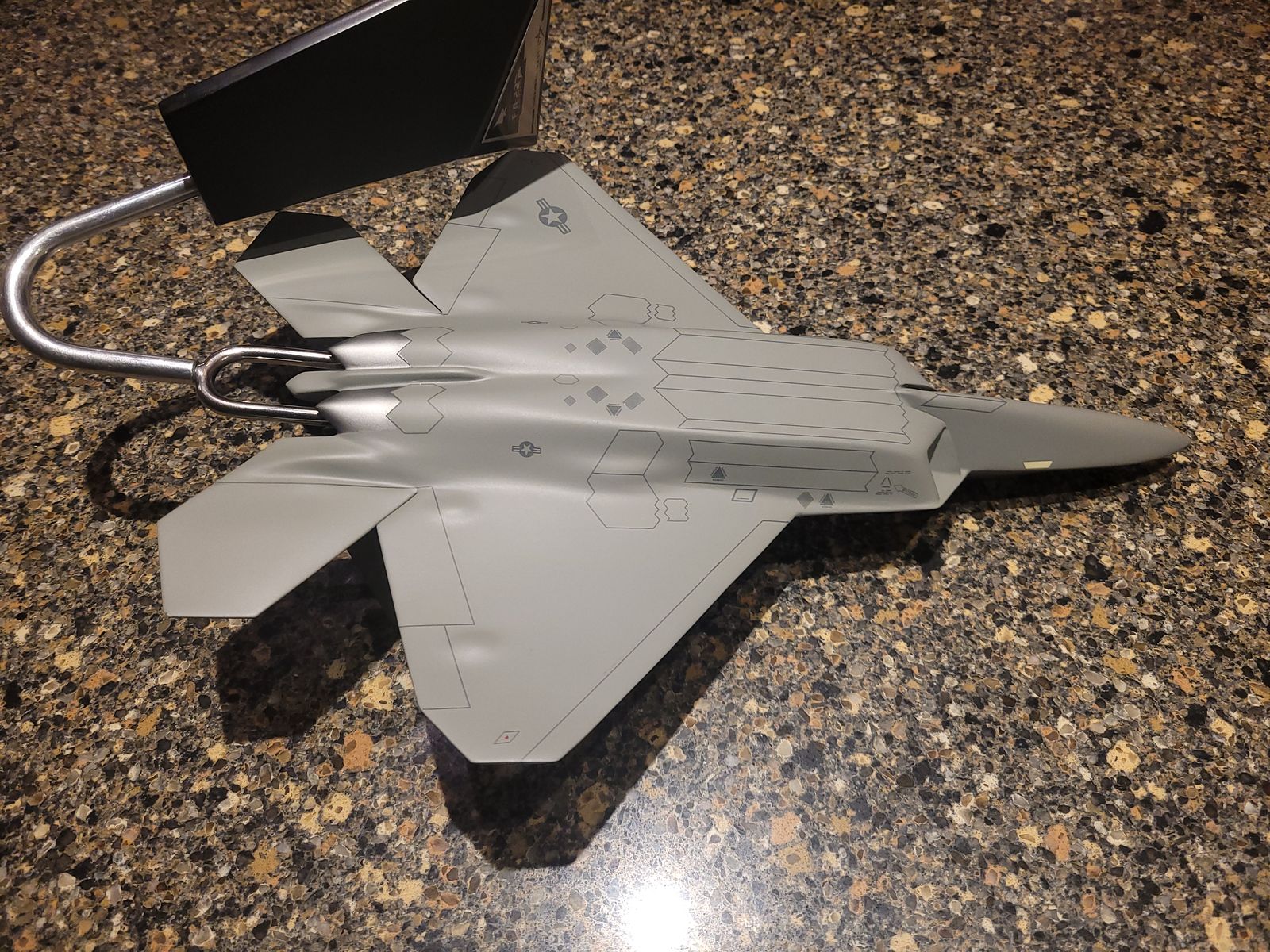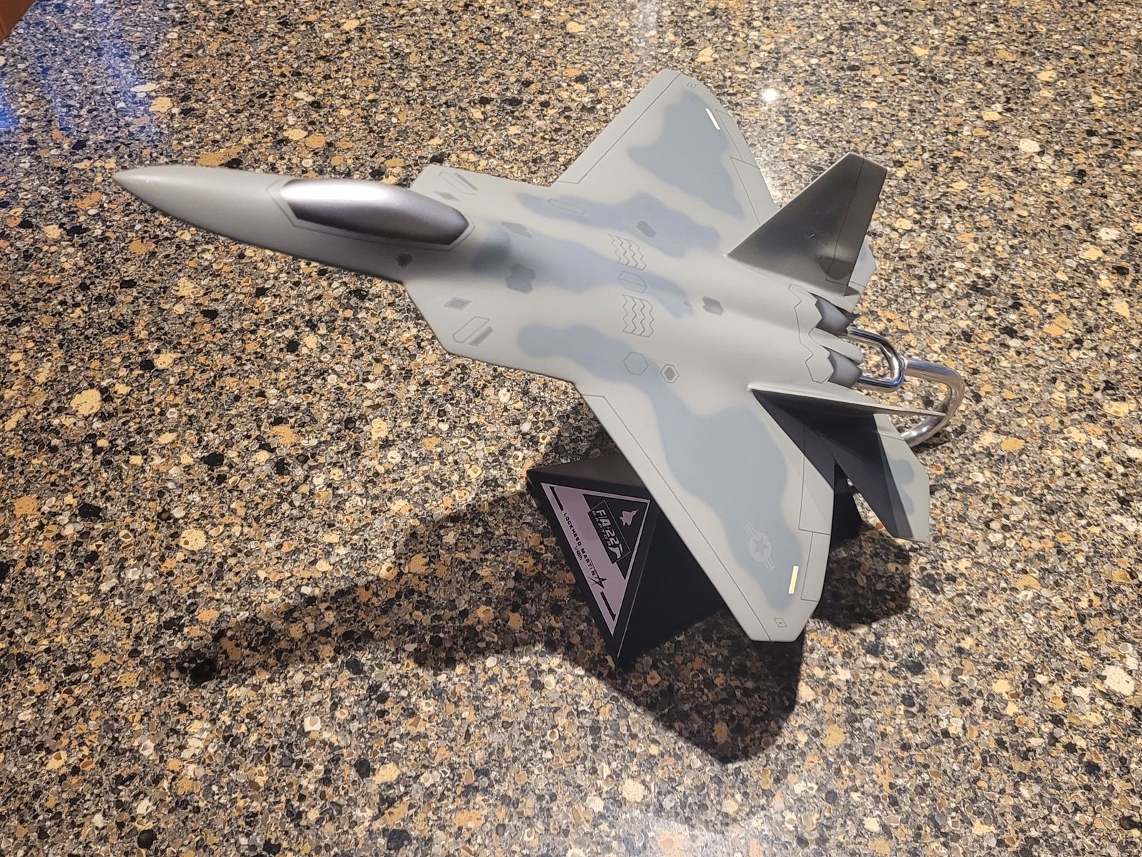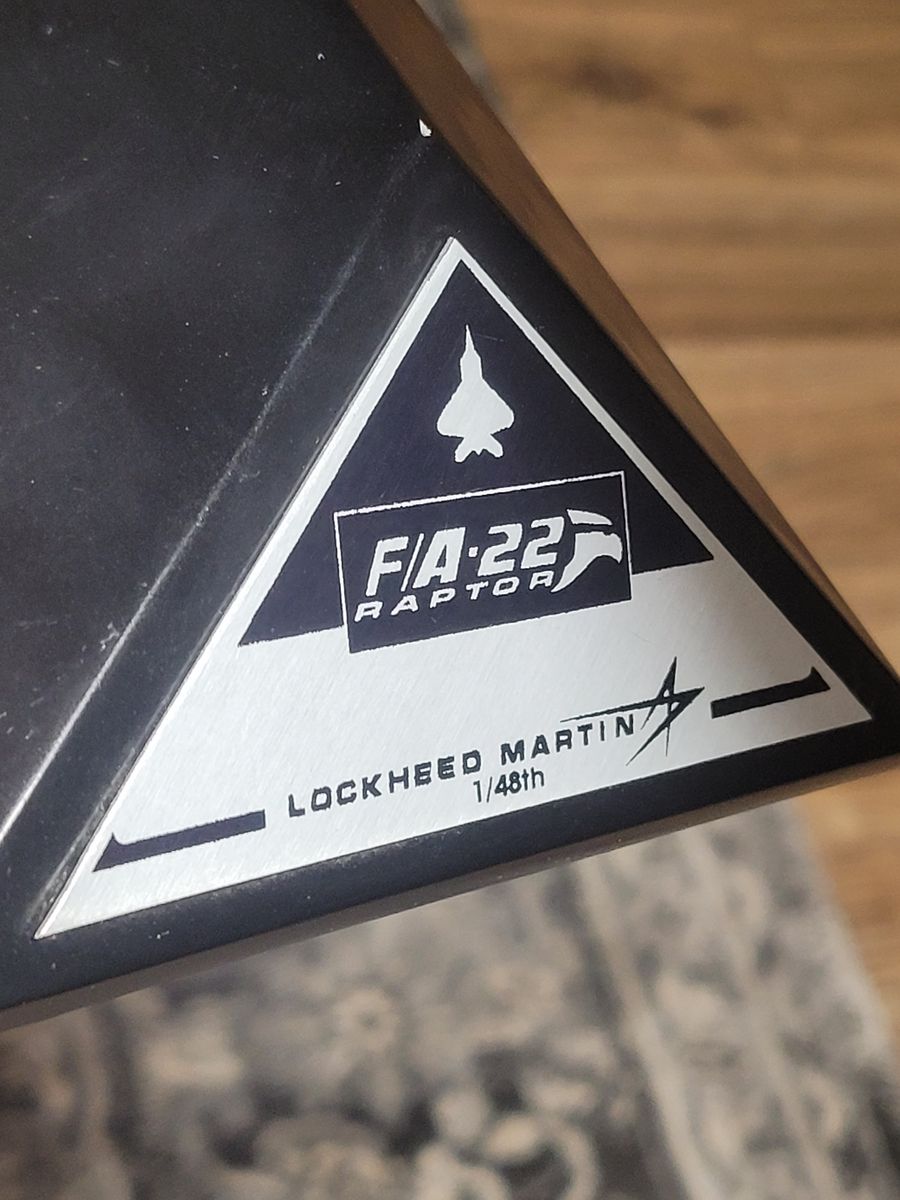 This majestic desk model is located in Salt Lake City, and was made in the Philippines. The base plaque has "F/A-22", which is the 2001 - 2005 designation. It would be easy to change it to the current designation "F-22" with a decal if desired. Model measures 11" wingspan, 15.25" length. Close inspection reveals just one small flaw - a tiny paint chip near the nose (see pic).