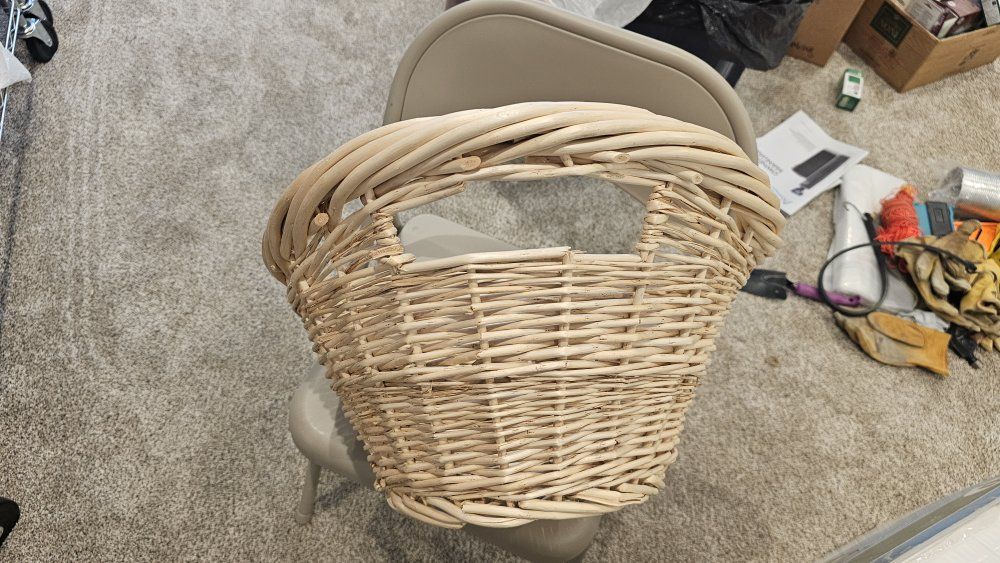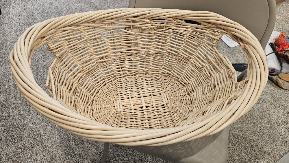 large oval willow reed basket apriximately 24x18x8 inches, lightly used, would make a great gift basket, or storage of stuff toys, blanket, linens.