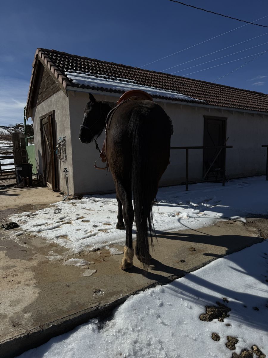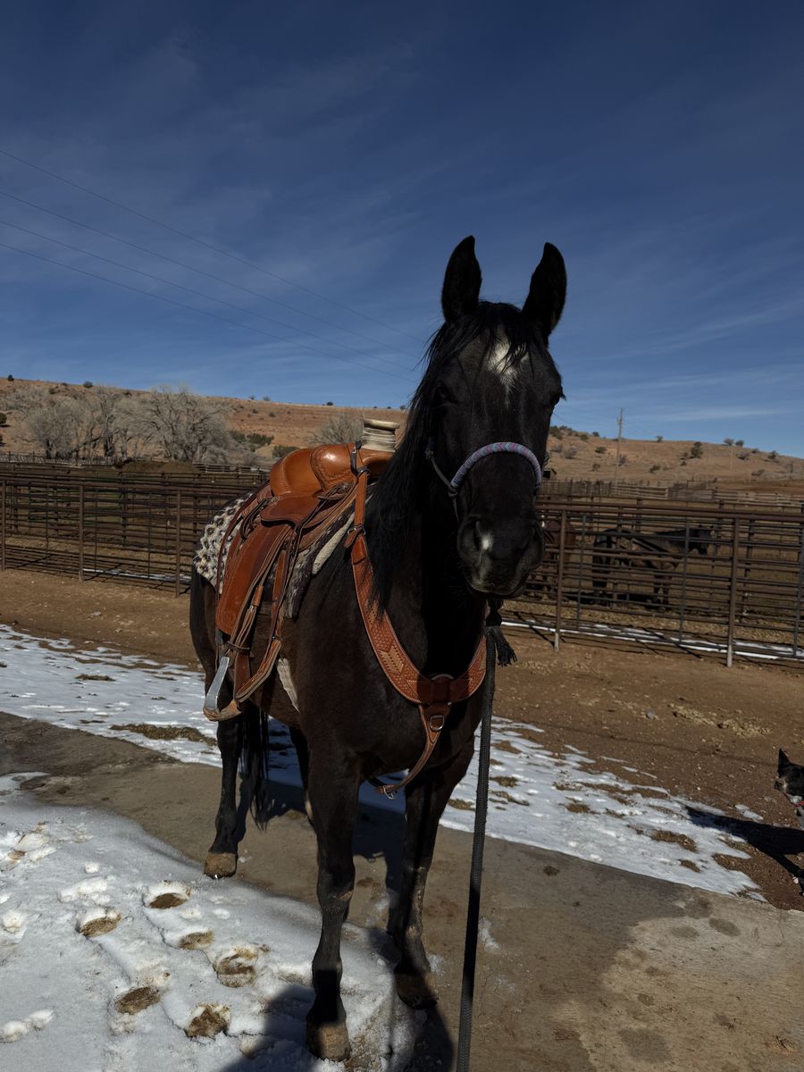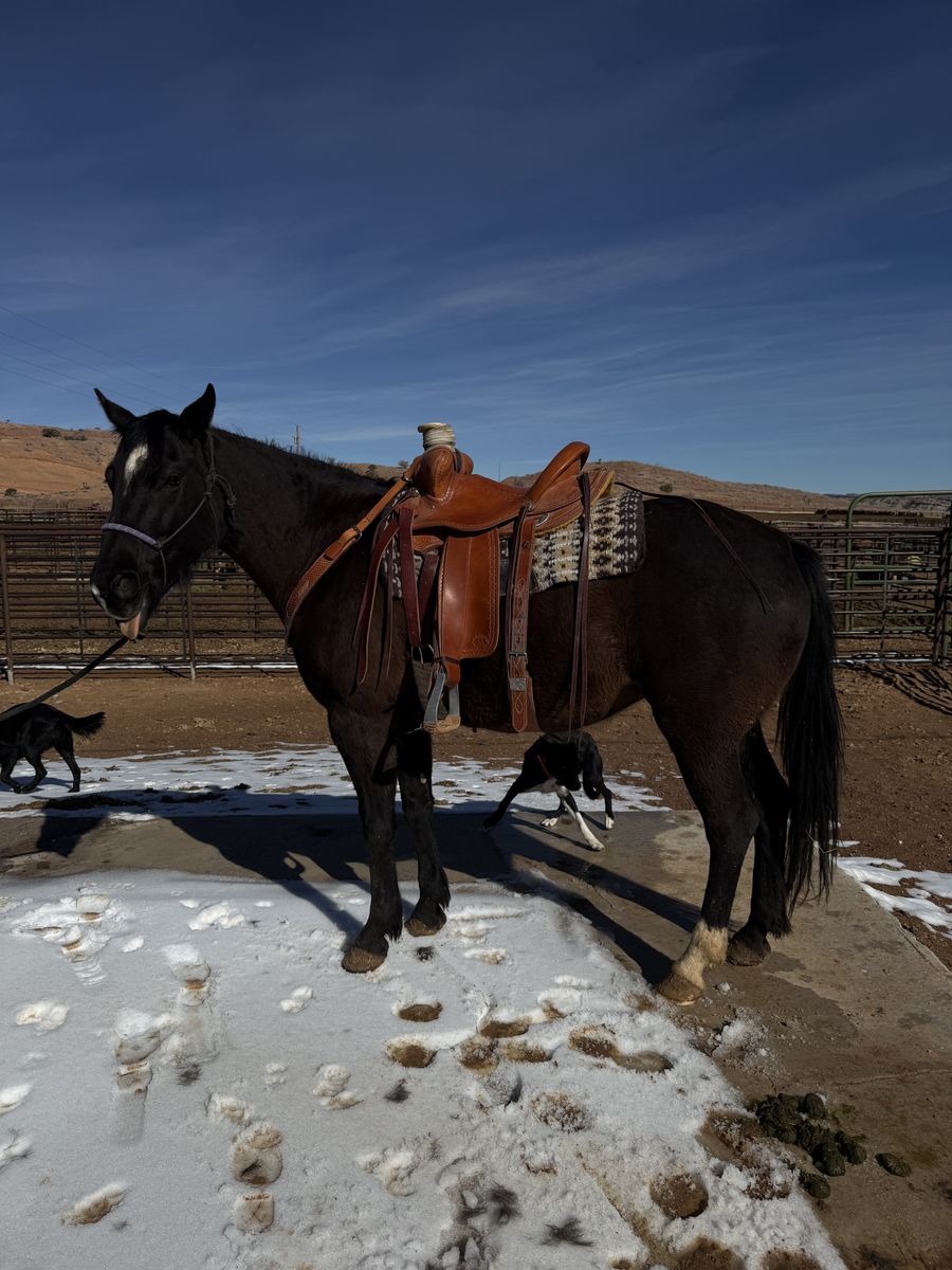 “Loretta” is a 4 year old grade mare. She has had about 90 days of training. She was started last spring, rode all summer, and maintained this winter. Her Dad is Aqha stallion. Her Mom is half thoroughbred half quarter horse. Loretta has been cowboyed on and has seen lots of country. She is young and is a little spooky. No buck. She is not mean just needs some time and love. Just got to many other horses. Priced for a cowboy. She is smooth, moves good, and goes all day. She’s seen lots of country. Crosses water great. Been around dogs her whole training. Stands great for the farrier. Willing to answer any questions. Text is best. Also have some videos for those interested. Can get her vet checked if you’re serious. She’s located on the Sandy Ranch. 4000 obo