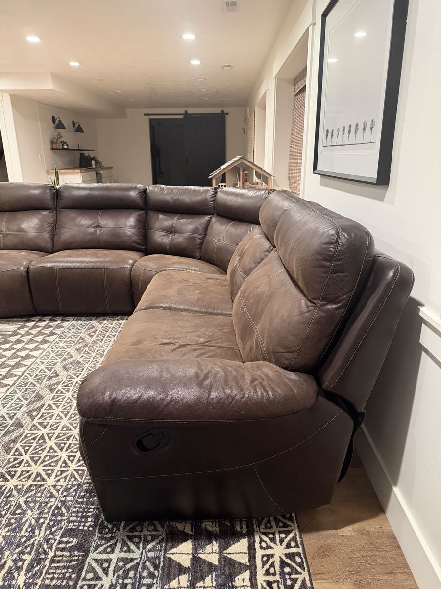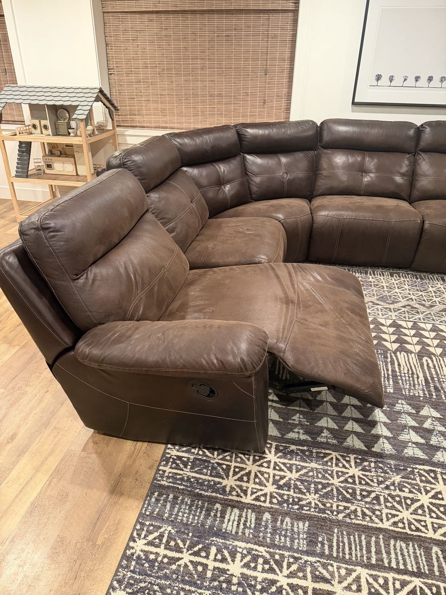 Leather look sectional purchased from Down East Home. No rips or tears. Has a recliner on both ends, left recliner still folds in and out it’s just crooked. In great condition. Lots of life left it in. Very comfortable! Smoke free home. Approximately 9ft by 9ft, 40” deep.
