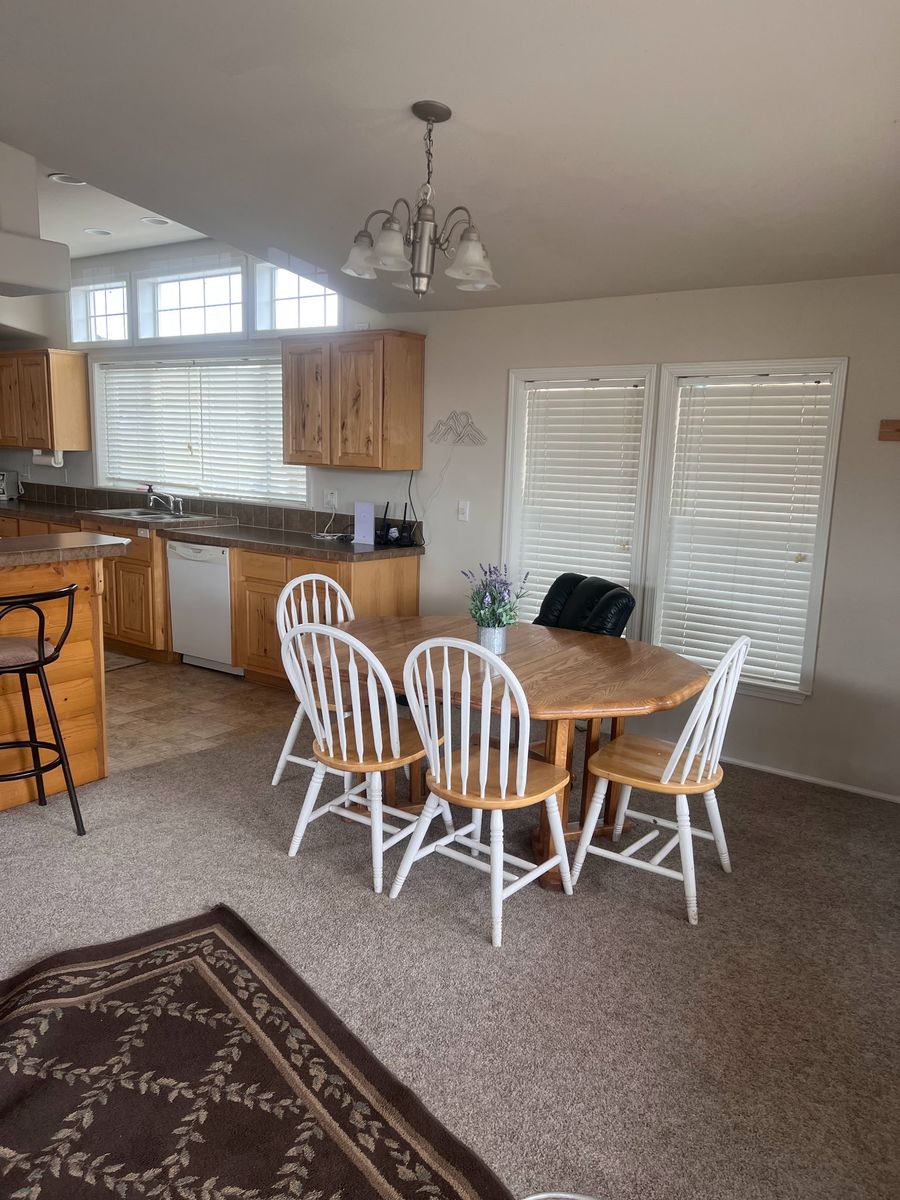 The primary residence sits on an elevated location overlooking portions of the river bottom and surrounding mountains. The home measures approximately 1,674 square feet and includes three bedrooms and two bathrooms. It is positioned above a garage and features a covered wraparound porch that offers views of the river corridor and nearby mountain ranges. The home is serviced by electrical power, a culinary water well, septic system, and propane.