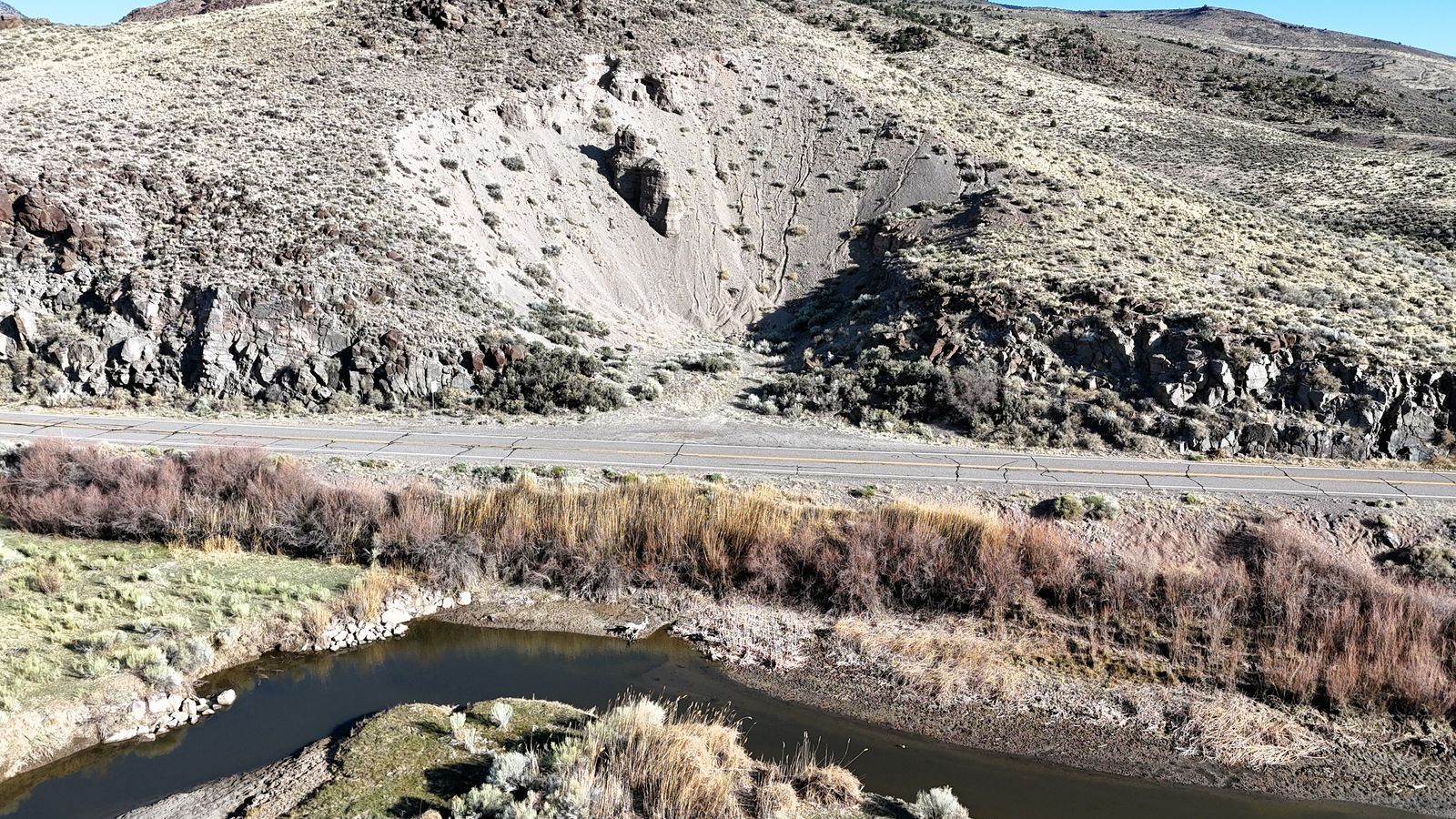 Highway 62 runs through the property, dividing the ranch into two distinct areas. The southern portion contains the river bottom ground and primary improvements, while the northern portion rises to sagebrush-covered benches with panoramic views of the surrounding landscape. The property is fully fenced and gated along the highway with established access points.