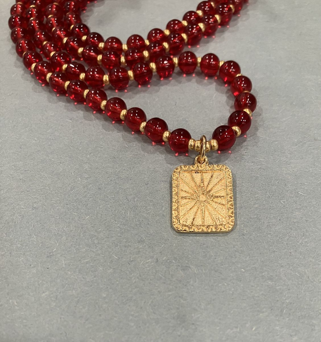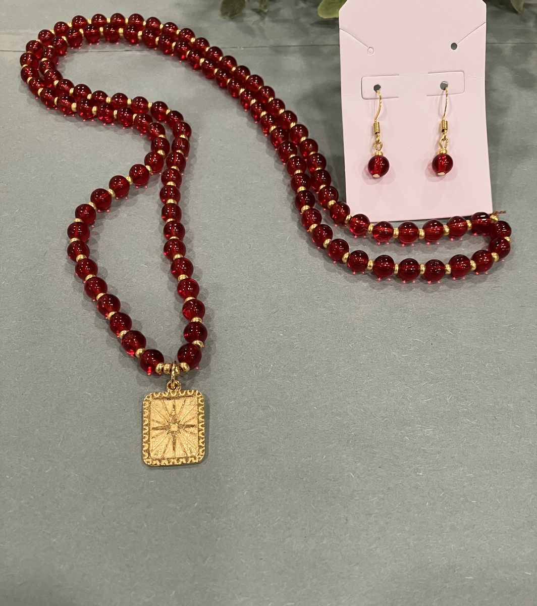 VenmoBeautiful vibrant red and gold beaded 32 inch long necklace with a 10k gold plated sunbeam pendant and dainty matching drop earrings. Earwires are gold plated. No need for a clasp for easy, comfortable wear. Gift box included. Local meetup or can mail with ship fee.