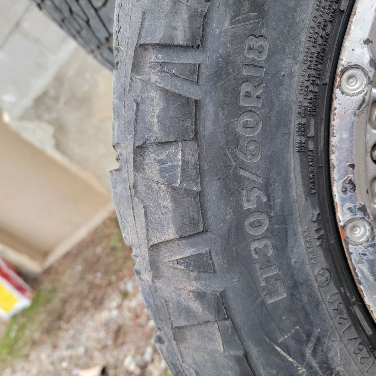 18 in universal 6 lug rims and tires. Tires on them are currently 305/60R18's. There are starting to cup a little, but still have some tread left. Come with lug nuts that fit a nissan titan or similar thread pattern.