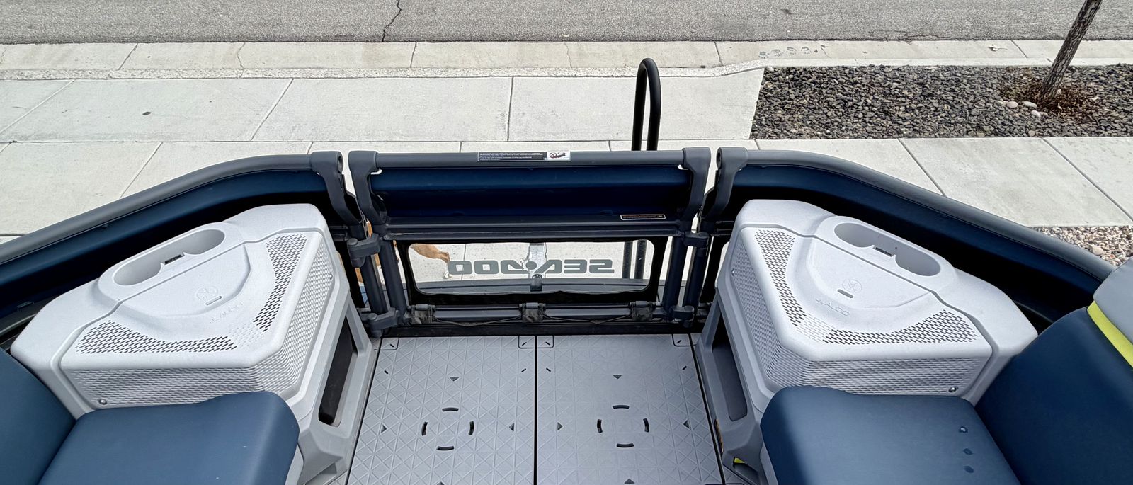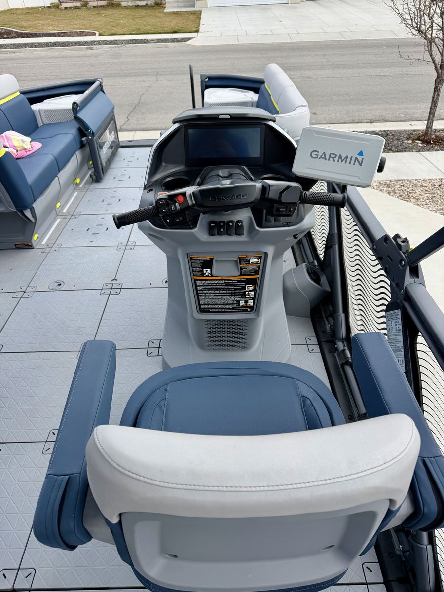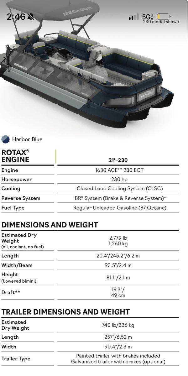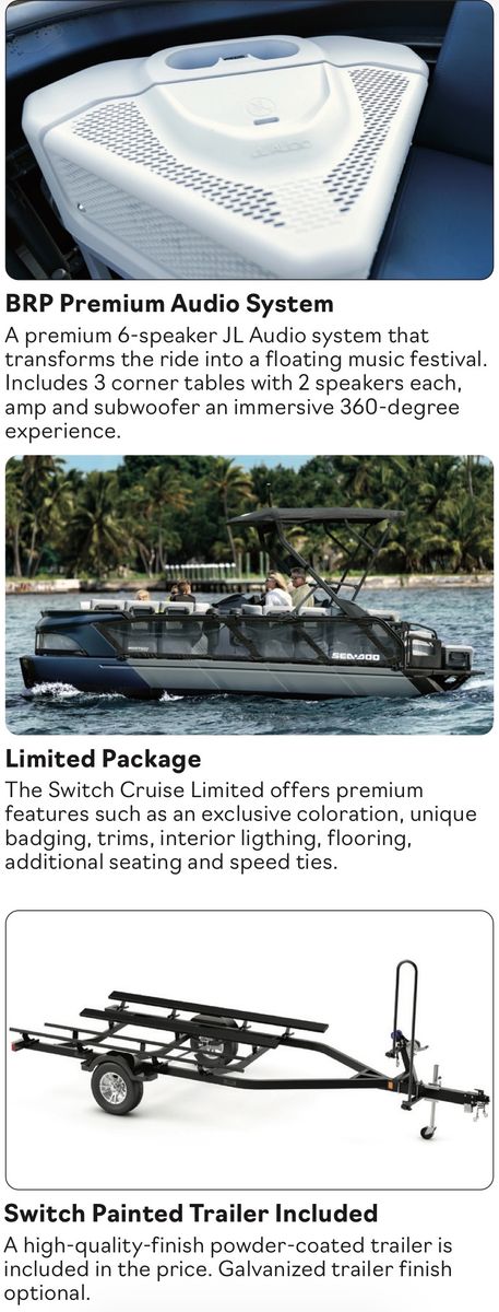 10 person capacity 10.25” touchscreen display Bluetooth Swim platform Cruise control Tri-Hull 230 HP Rotax Jet Engine PREMIUM BRP speakers and surround sound Lunch table Modular deck system
