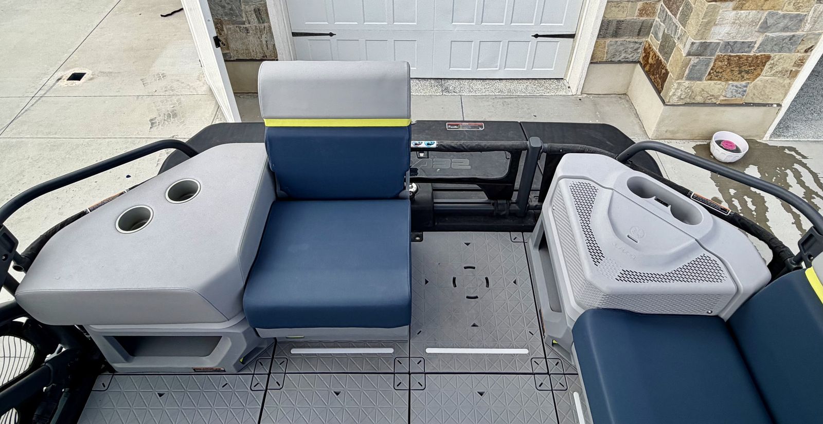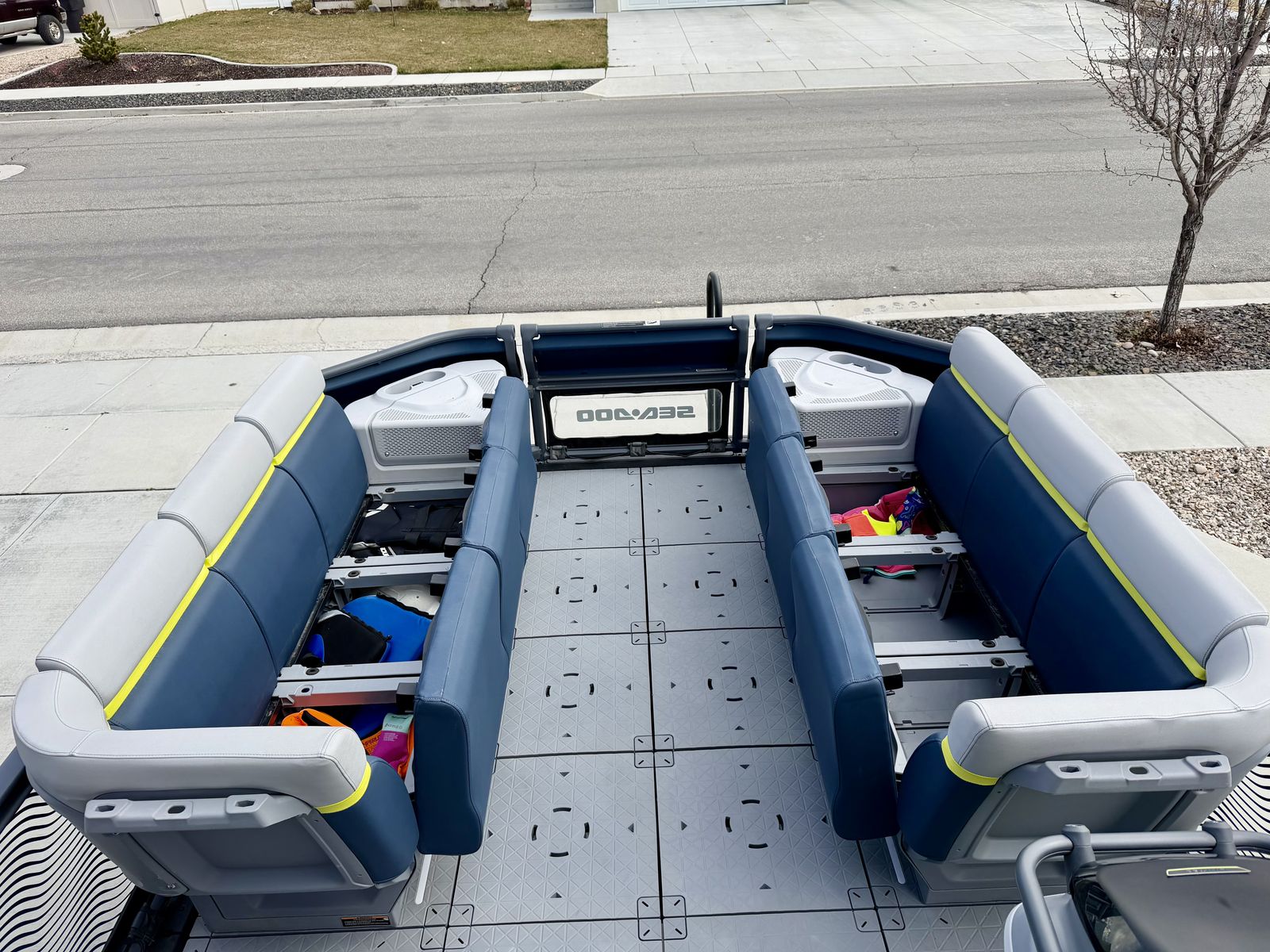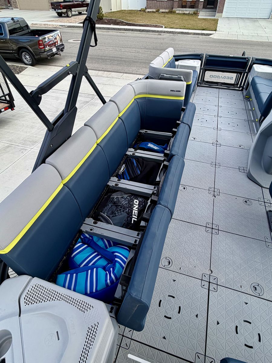 EXTRAS: Cushy deck mats - entire floor (soft and cozy, even in extreme heat) FULL Bimini top Wakeboard/tube/ski tower Garmin Transducer- fish and depth finder Additional deep cell marine battery (stay on the lake all day and night with lights and music) Kneeboard Brand new tube