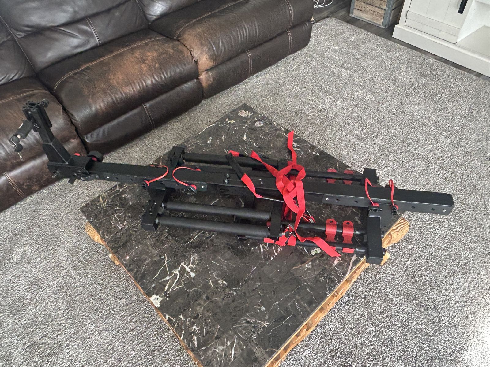 ZelleHitch-mounted ski/snowboard rack. New, never used. Fits 2” or 1.25” receiver. Carries 6 pair of skis or 4 snowboards. Key lock, security strap, adjustable tilt access