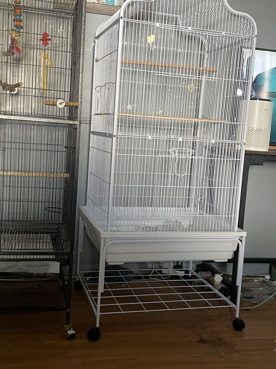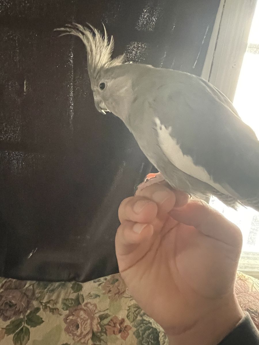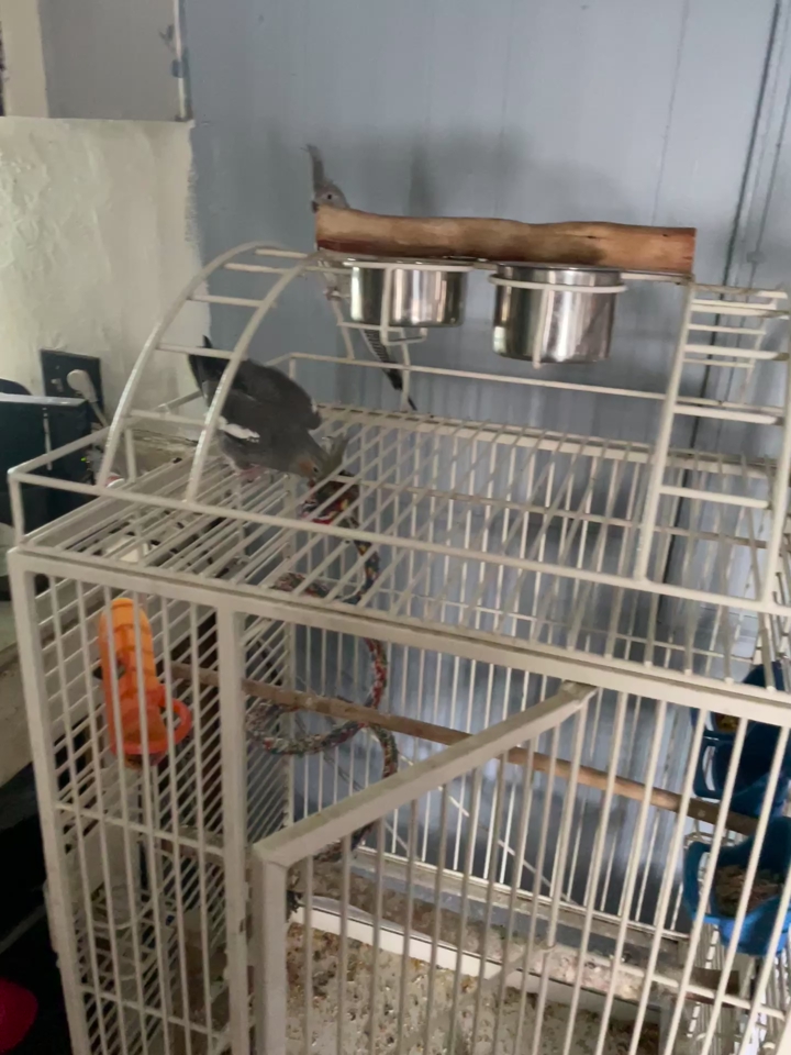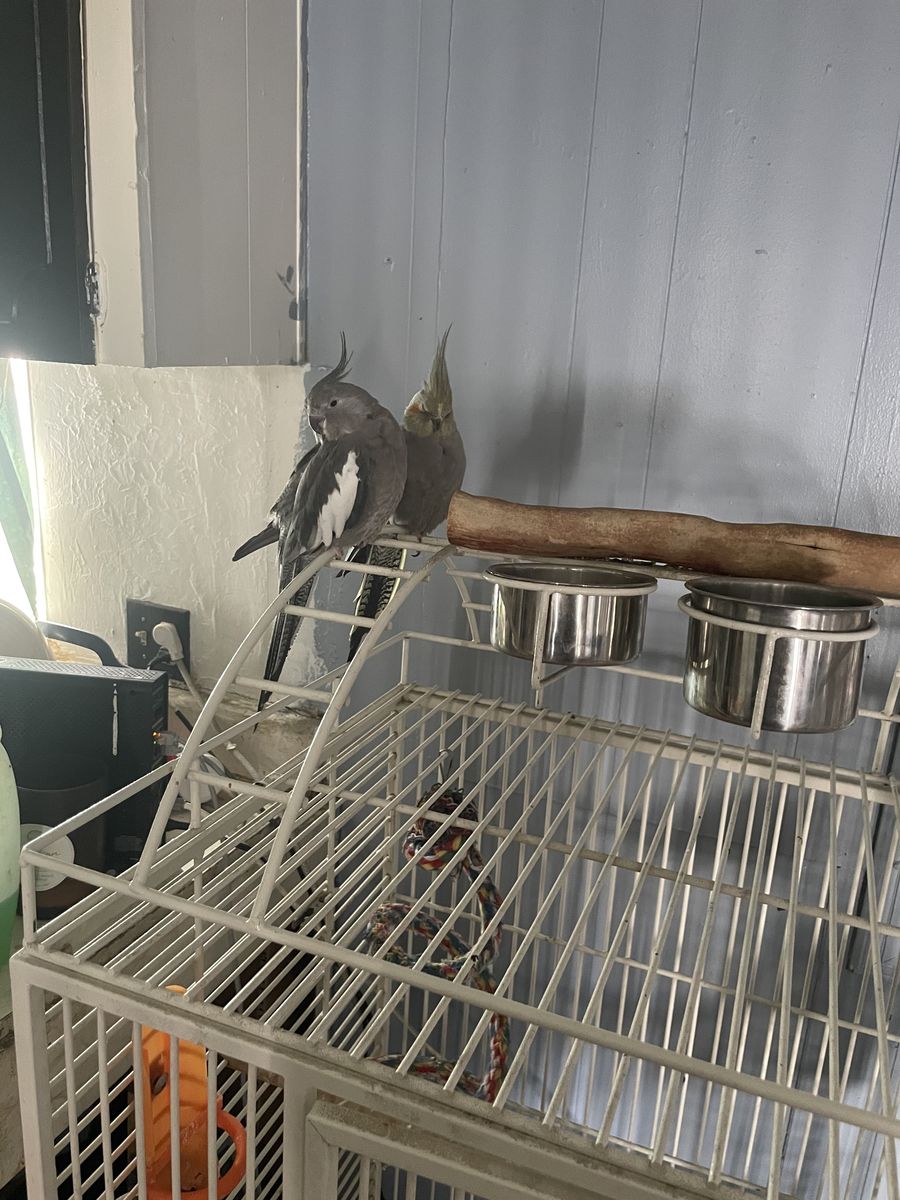 I have a peer grey cocktail, male no cheeks, 3 years old and the female with cheeks grey three years old as well. I tried putting a nesting box in their cage, and they didn’t go in it the very sweet the male is calm and let you grab them most of the time and the female likes to be her own boss. She will fight to your head multiple times today. If you have kids, it’ll be pretty cool. Because she’s just flying at your head so fly to your shoulders sometimes they’re very nice cage you have to screw in one of the corners. Other than that it’s pretty new.