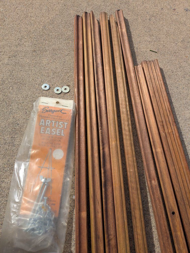 VenmoThis unused wooden Artist's Easel is still in the original bag, and includes a chain, screws with wing nuts and washers. This would be great for the outdoor artist. Although unused, This easel was stored in the garage and has some water damage. Comes from a smoke-free and pet-free home.