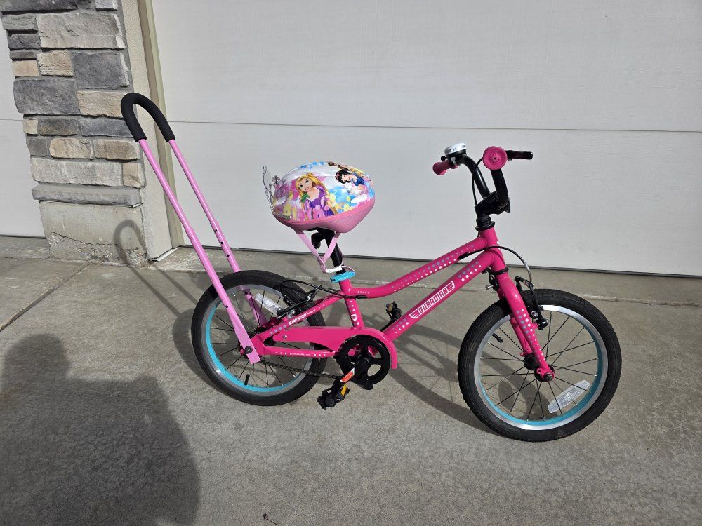 used only 1 seaon. like new condition. I added a handle to the back to help teach my daughter to ride. Princess Helmet included.