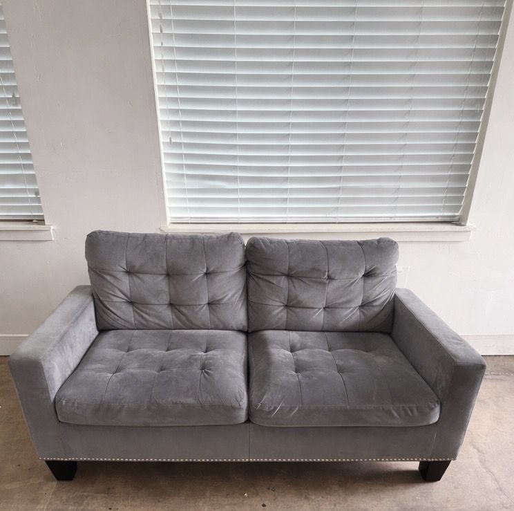 Beautiful gray velvet loveseat with tufted cushions and nailhead trim. Very comfortable and in great condition. Clean and ready for a new home. • Modern gray velvet fabric • Tufted back and seat cushions • Nailhead trim detail • Solid and sturdy Free delivery depending on your location