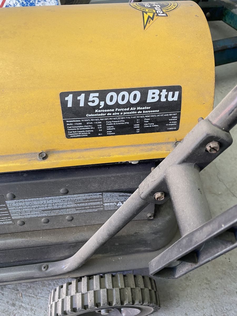 115,000 BTU construction heater Very cood condition Only used in my shop I work on heaters and guarantee this to work. I only used kerosene in it to keep everthing clean
