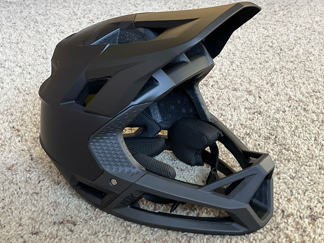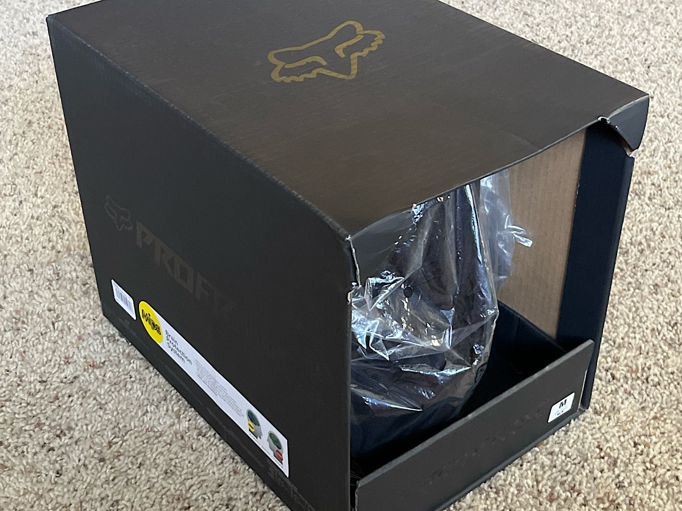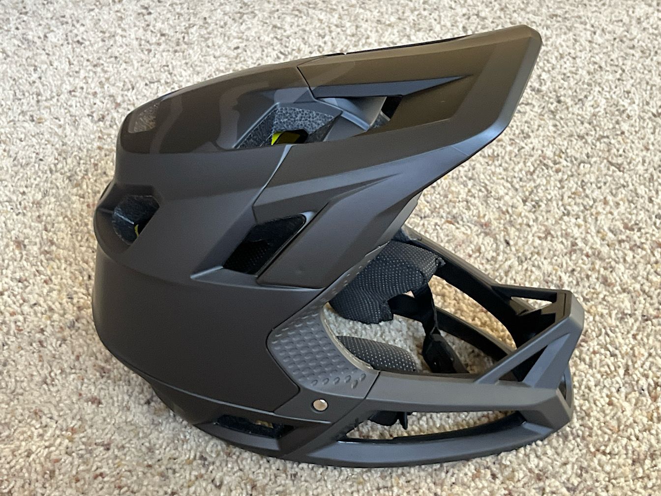 New matte black Fox Racing Proframe MTB helmet, MIPS, size Medium (US 7-7 1/4" / EU 56-58 cm), with documentation and all pads, in original packaging.