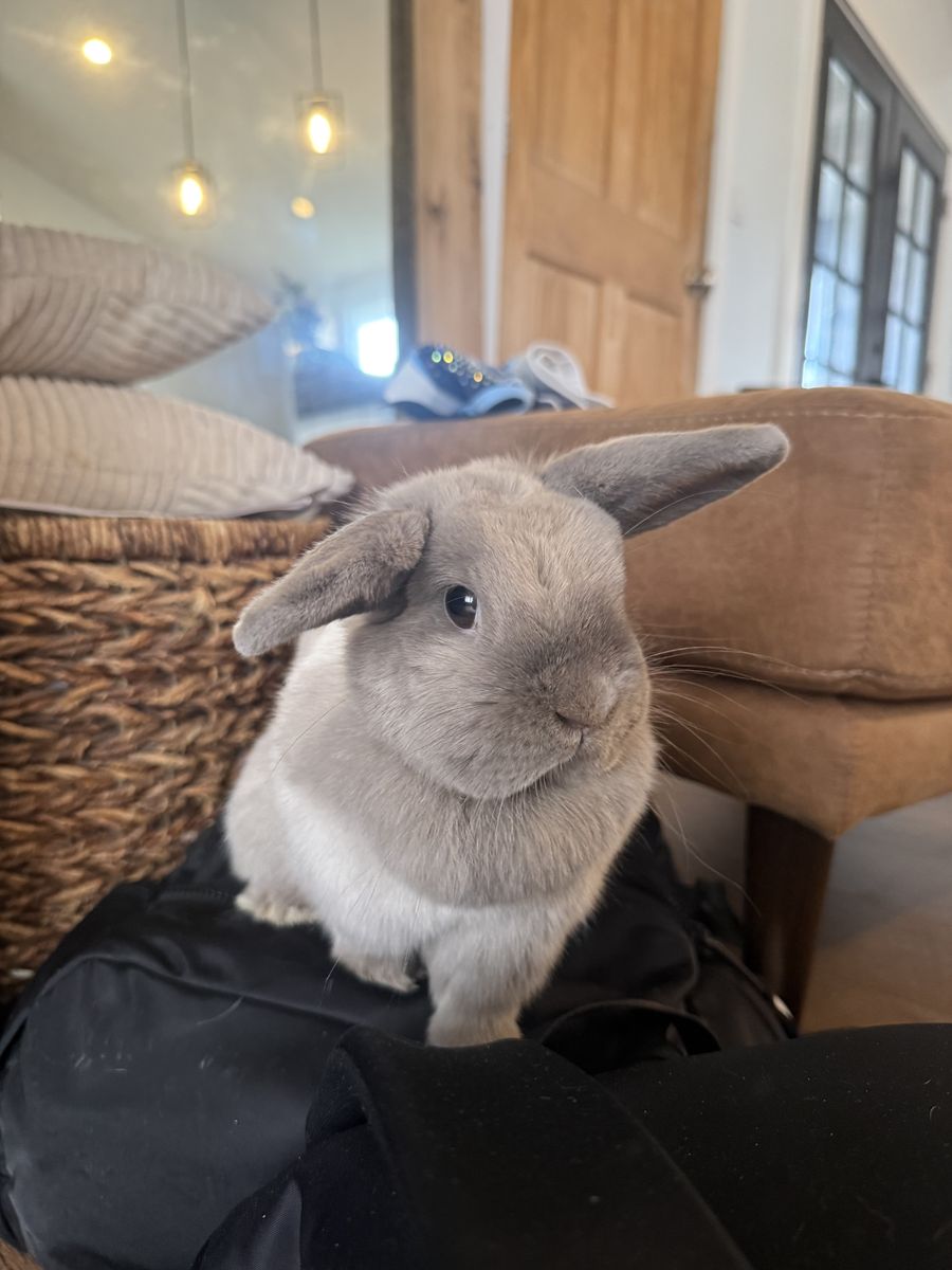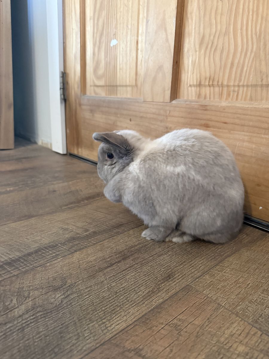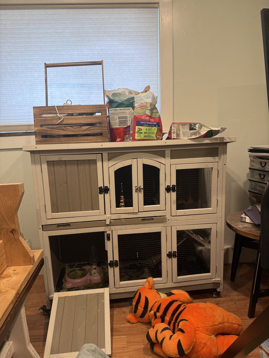 Over a year old, female bunny. Super sweet and very playful. Comes with two story bunny house as well.