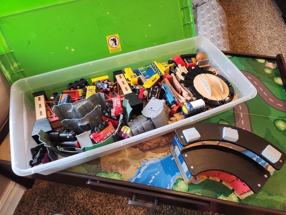 3 different train sets, lots of characters from Thomas and friends. Table top is also reversable.