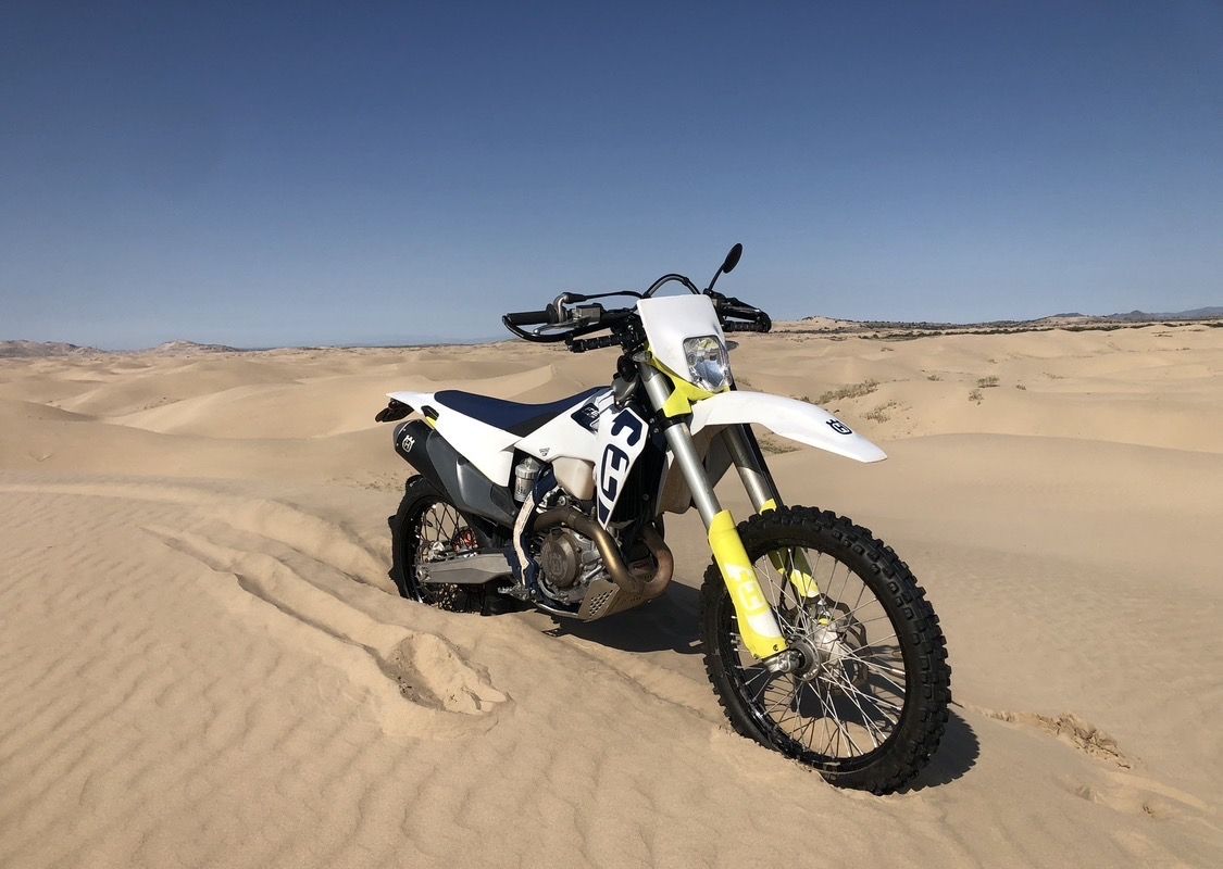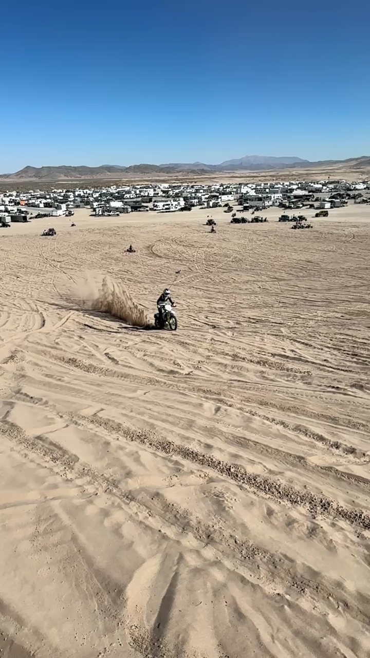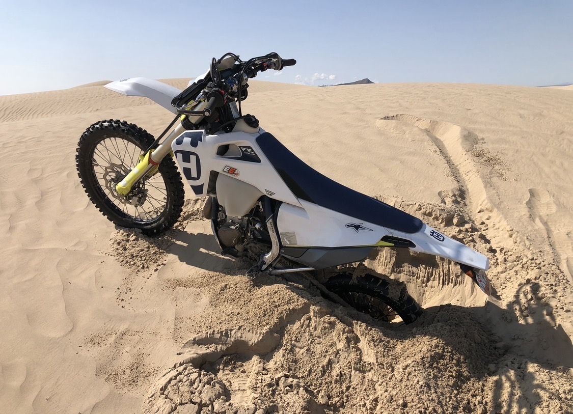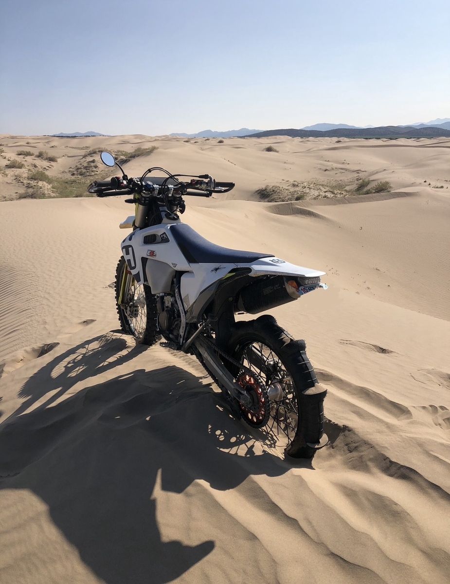 The 10-paddle tire setup absolutely rips in sand (Little Sahara etc.) and climbs anything. The bike has tons of power and never runs out of thrust even on steep dunes.