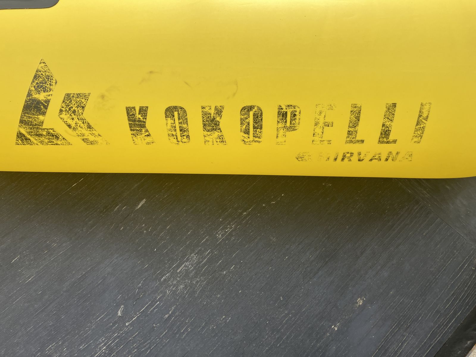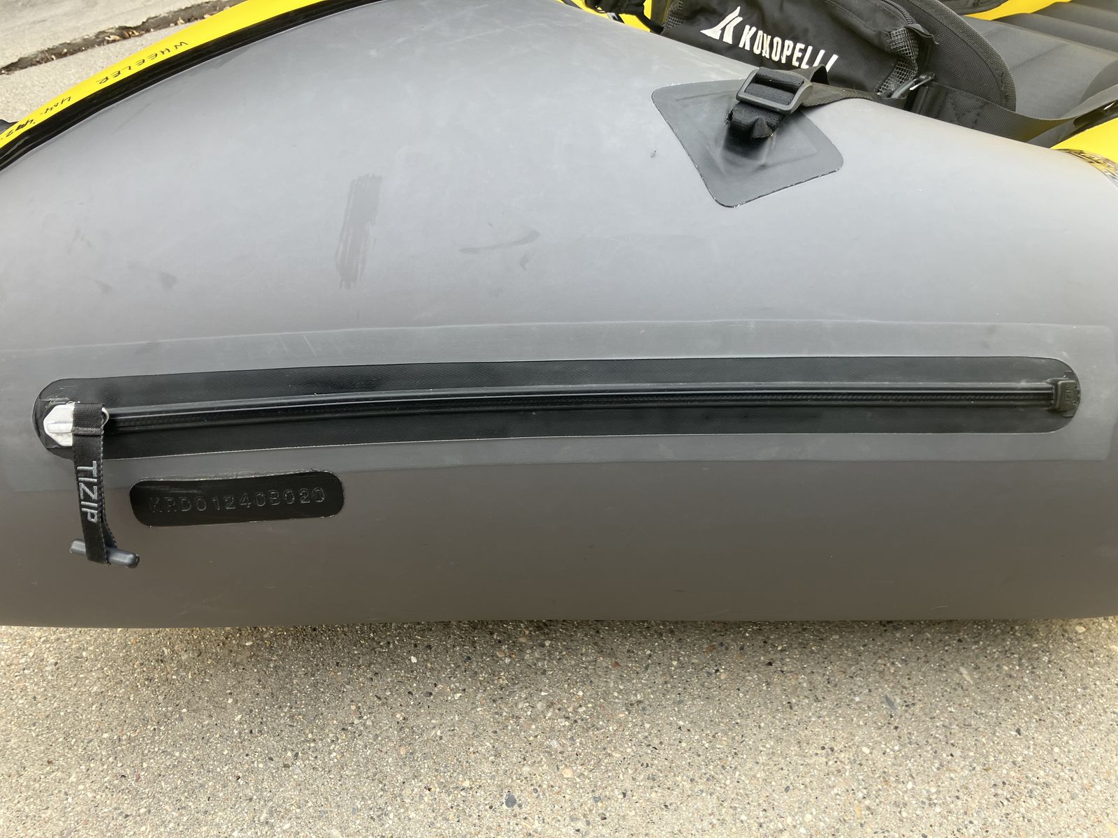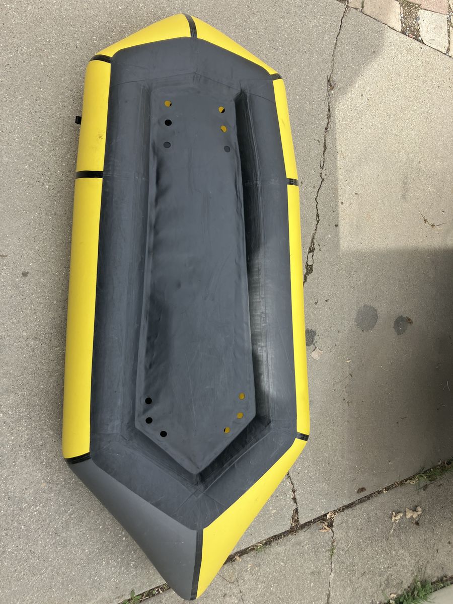Notes on condition: This is a used boat! I've treated it with 303 regularly to help prevent UV damage, and it has always been stored clean and dry, but the logo is showing signs of wear. The tubes themselves look good as new. There are also some abrasion marks on the bottom from scootching over rocks and such. The TiZip, valve, seat, etc. are all in great shape and it has never had any leaks or punctures. I also wrote my name and phone number in sharpie on the stern (hence the black squiggly in the second photo). Basically, it is functionally perfect but does not look pristine.