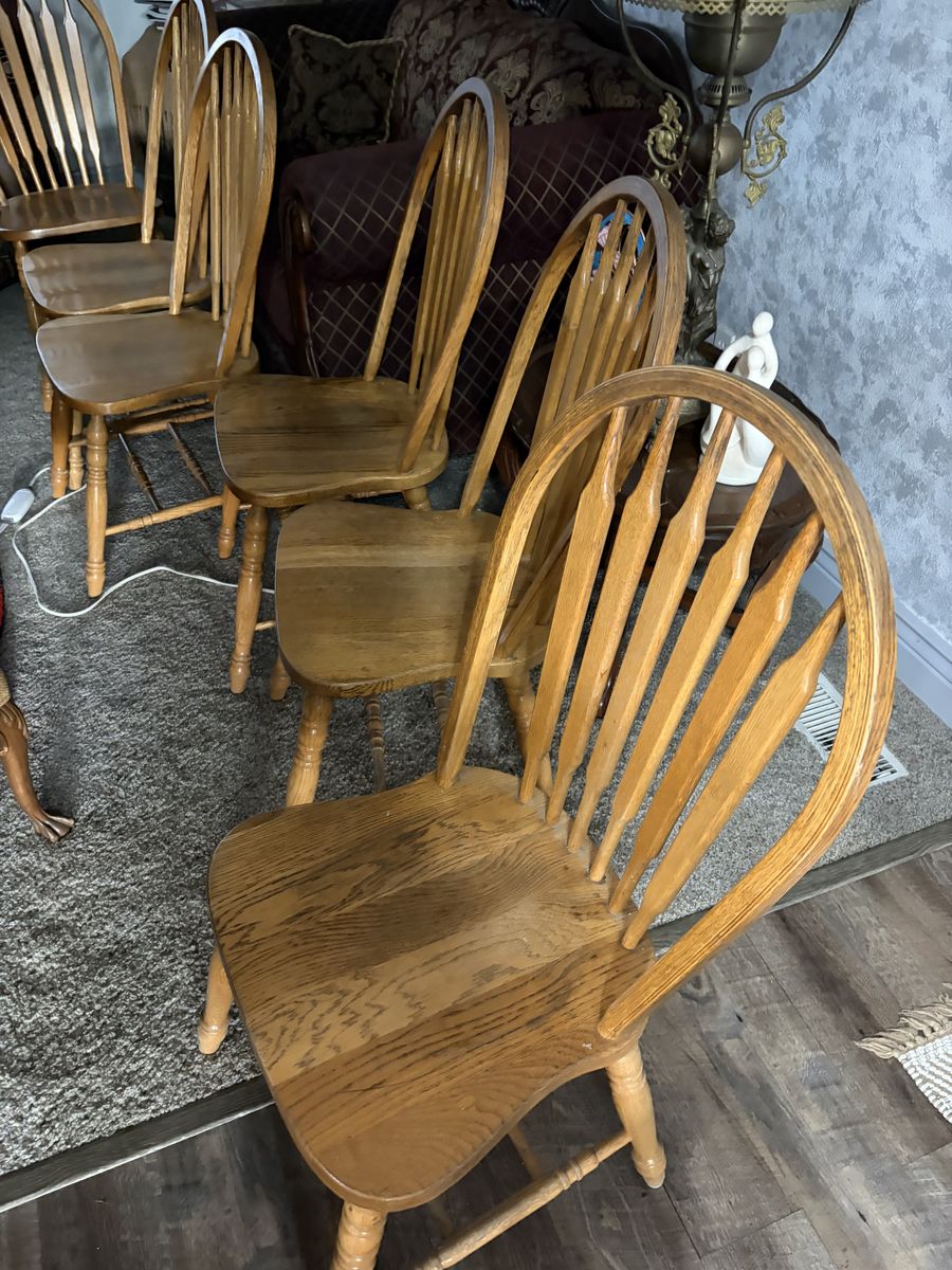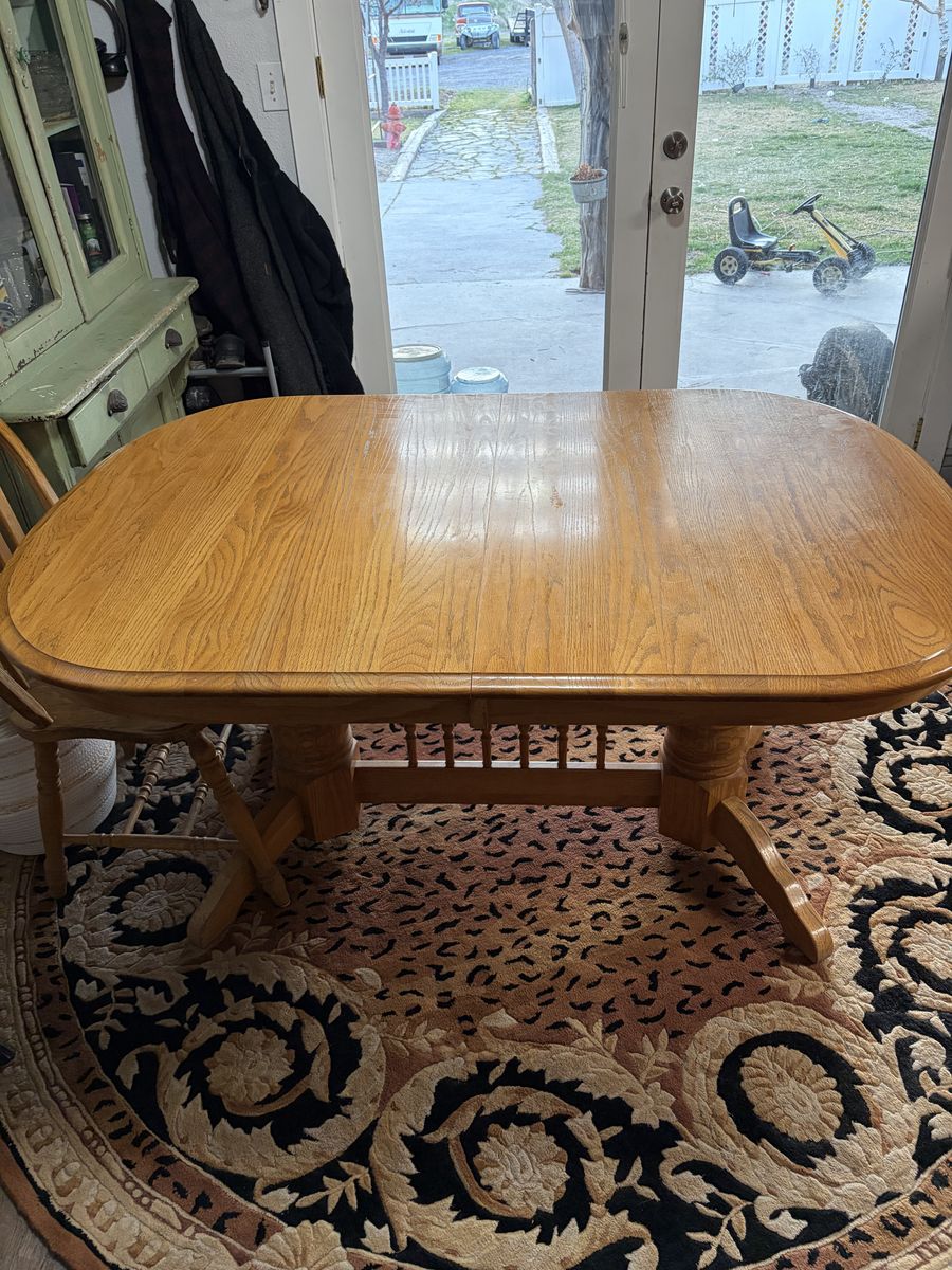 Comes with two leafs not shown and 6 solid oak chairs can seat up to 10 people comfortably