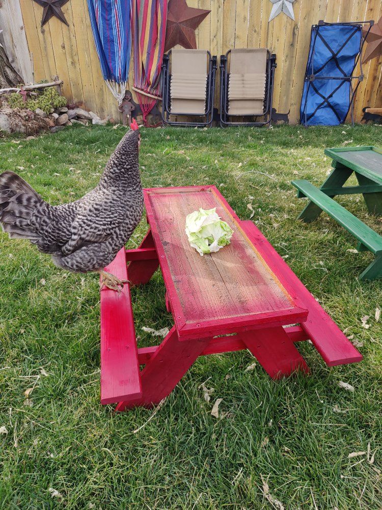 Chicken Picnic Table. Custom made W/ cedar 🪵 wood & Painted. 30 x 24 x 15 tall. Enough to fit the whole chicken family! Only one red. And only one green. first come first pick.